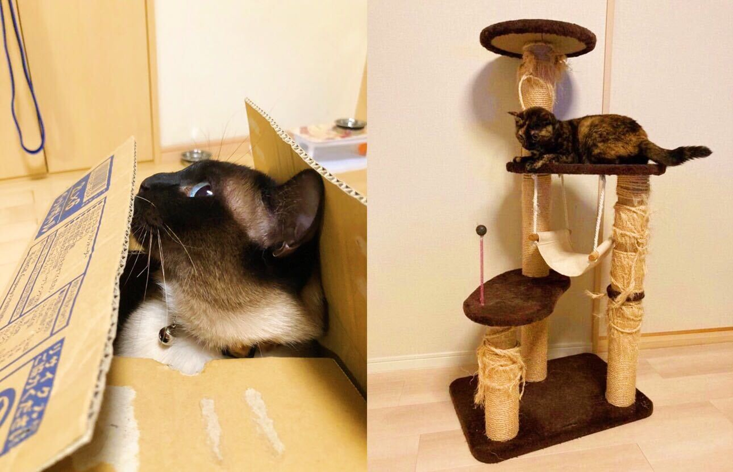 右:キャットタワーで自由に動き回る猫