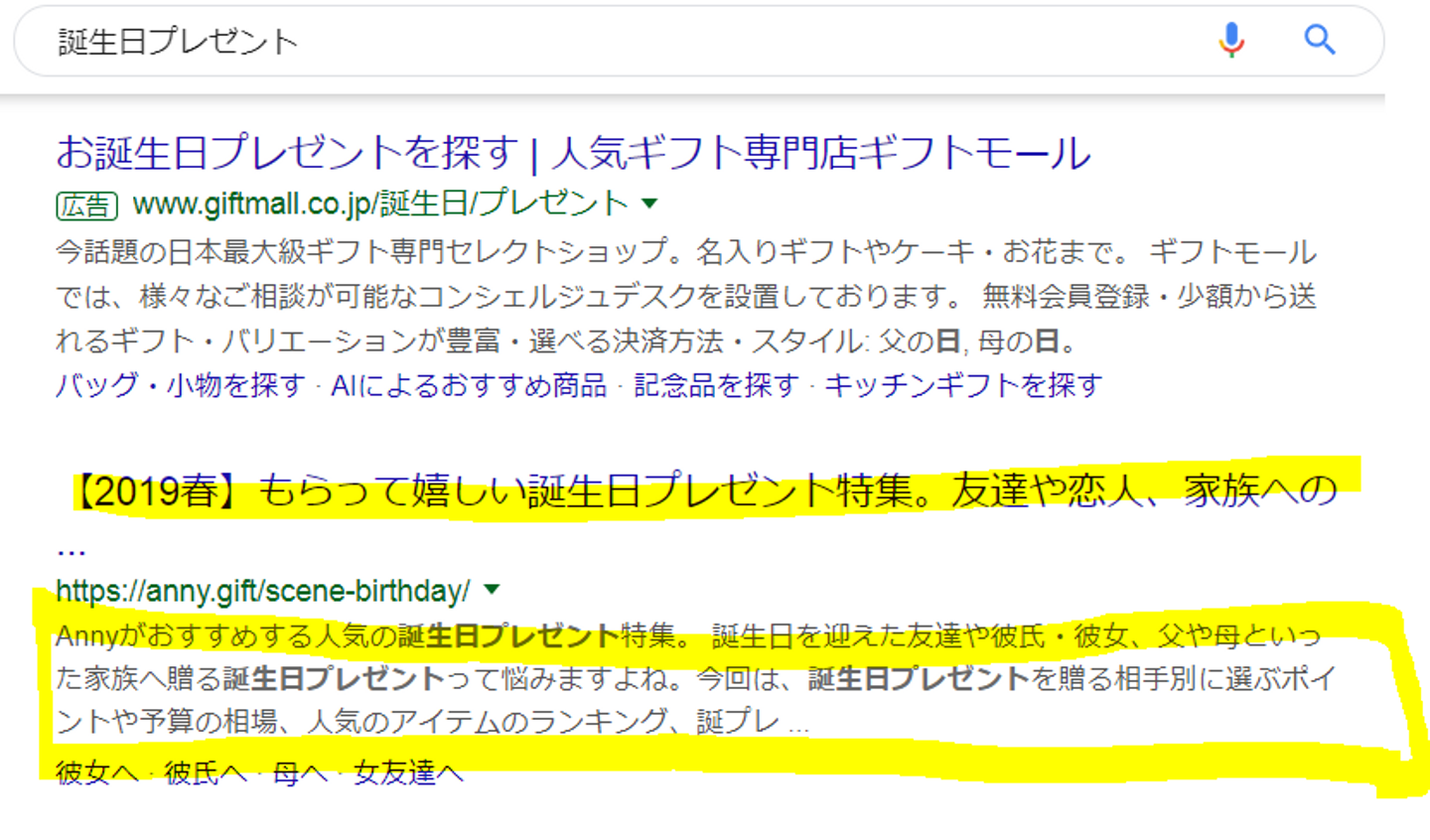 ↑検索エンジン上での表示例です。黄色線を引いた部分がサイトのタイトル、黄色枠で囲まれた部分がサイトの説明文になります。