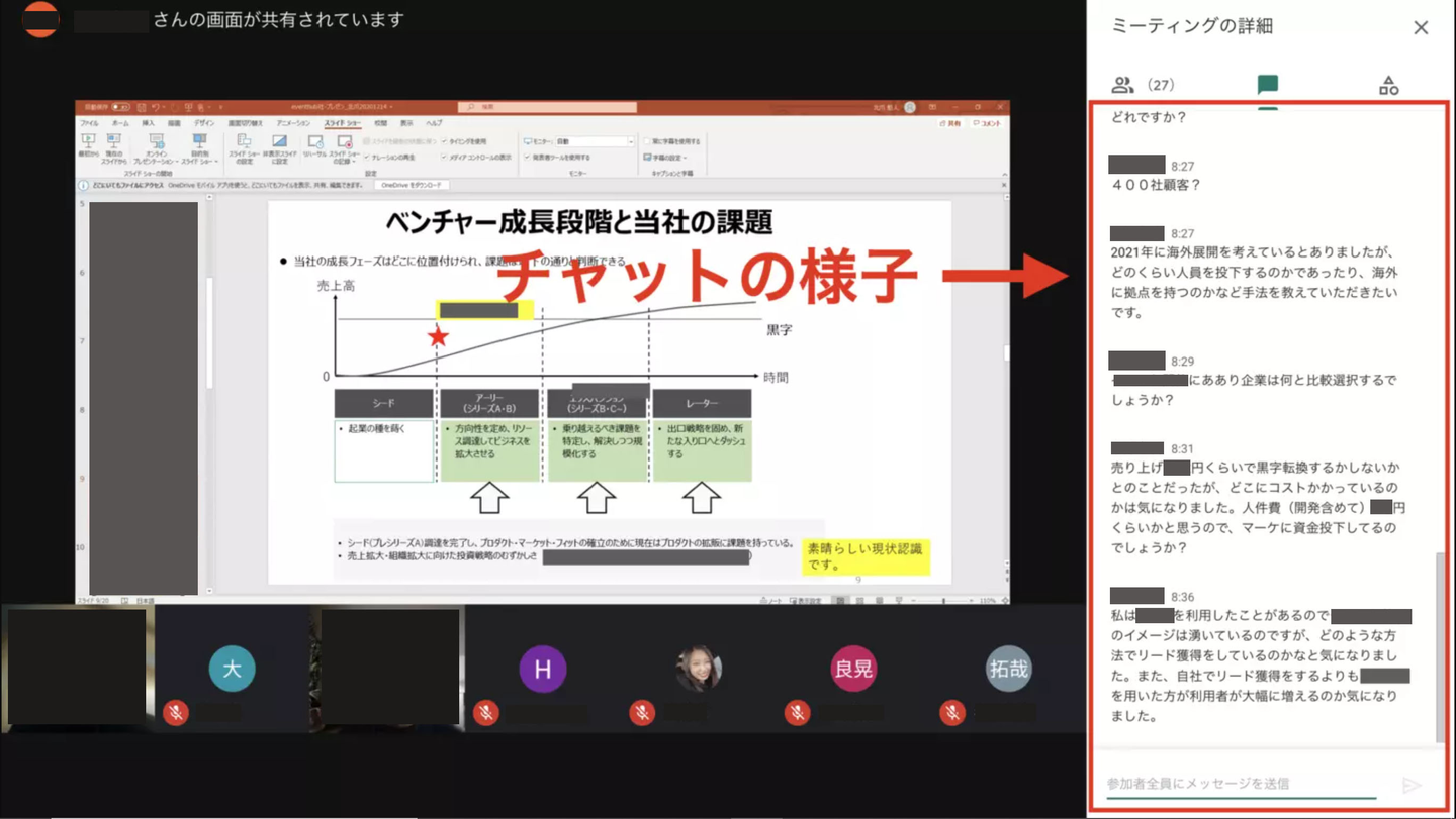 27名が参加しており、わからないことや気づきがあればすぐにチャットへ。場合によっては、Zoomのブレイクアウトルームやホワイトボードといった機能を活用し、参加者が満遍なく議論を行えるよう細部にまで配慮。そういった参加者の意欲だけではなく、運営側の姿勢も新鮮でした。日頃から経営者の方々やCxO人材の方々とお仕事をされているからこそ、学びに対して貪欲であり、他人事ではないという状態が作られているのかなと感じました。