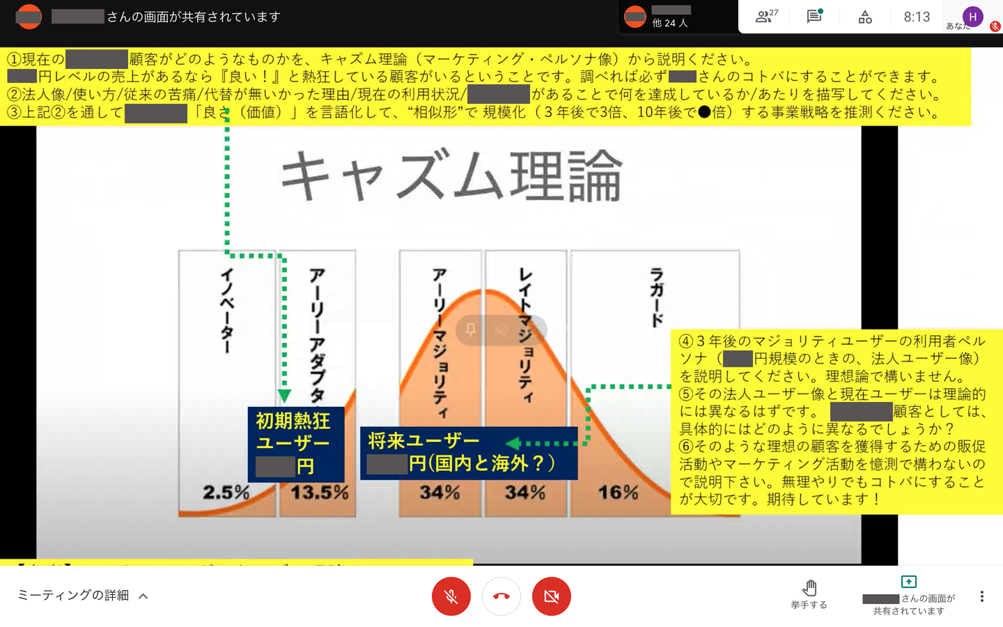 当該企業の商品普及率に「イノベーター理論」「キャズム理論」を当てはめると、このような問題点が浮かび上がってきた、という流れです。