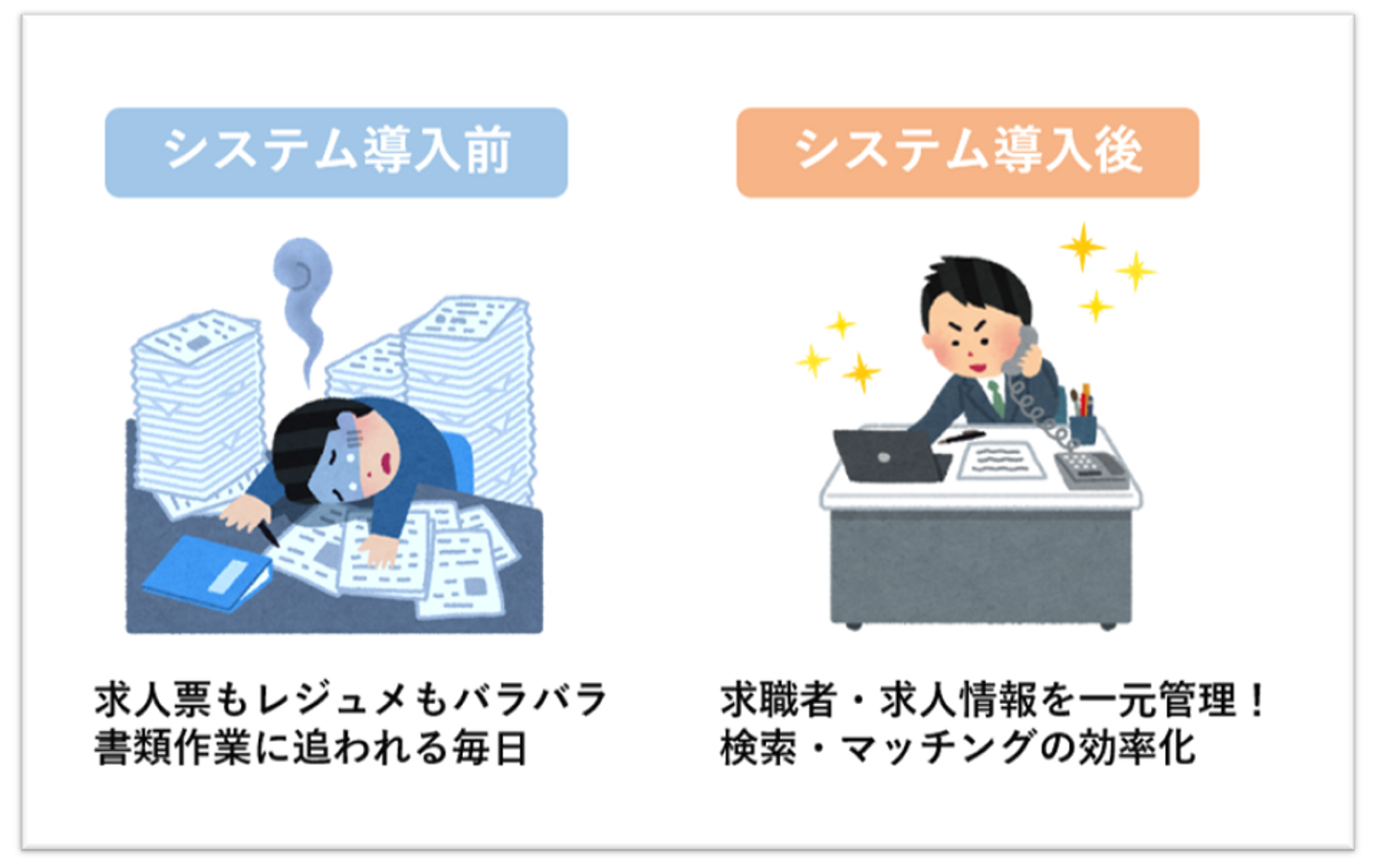 この業務用管理システムとは、簡単にいうと、エージェントさんがスムーズに求職者と企業のマッチングを行えるように情報を一元管理するためのシステムのことです。