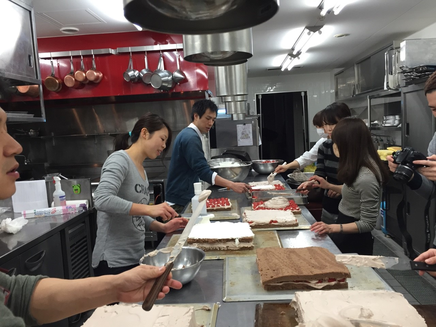 キッチンメンバーだけでなく、ドレスコーディネーターもプランナーもサービススタッフもクリームを塗ってイチゴを並べて・・・慣れない手つきで愛情を込めてケーキを作っていきます。