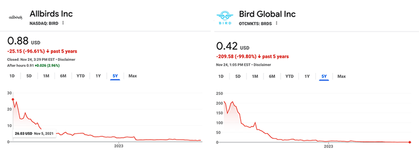 かつてユニコーンだったAllbirdsとBirdは共に上場後大きく株価を下げている