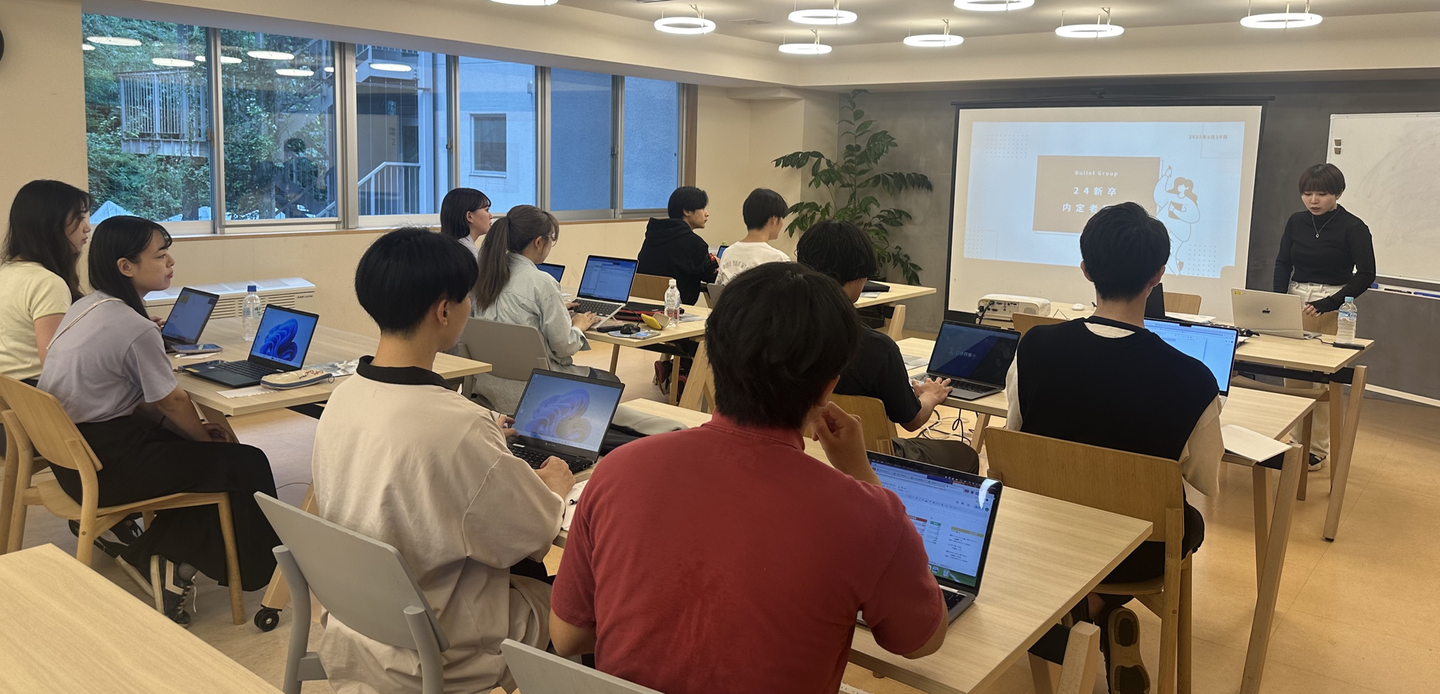 バレットグループの内定者研修は人事が内定者の成長を願ってゼロから作成したオリジナルのプログラムです。座学とロールプレイング・発表を繰り返しながら、習ったことを実践で使えるように頭と体で覚えていきます。24年卒の内定者たちもすでに、配属先の各事業部でインターンが始まっているので、ある程度の基礎はしっかり勉強していますが、やはりもう一度しっかり教わることで間違って認識していた内容に気付くことができました。