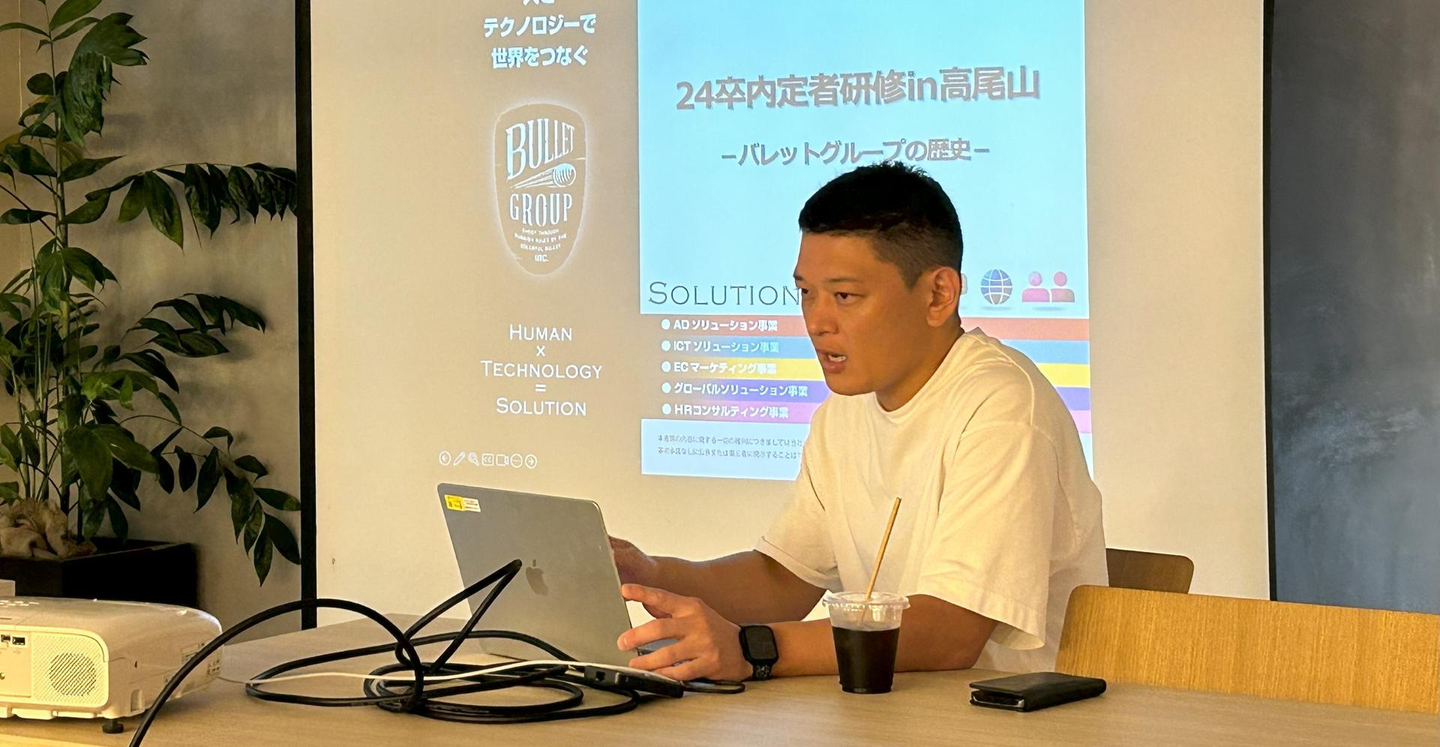 2日目は前日の夜からサプライズで参加してくれた役員の後藤が、会社説明をしてくれました。バレット創設者が話す企業の歴史や創立時の想いは、とても深く熱いもので、何度も聞いている私も聞き入ってしまいました。