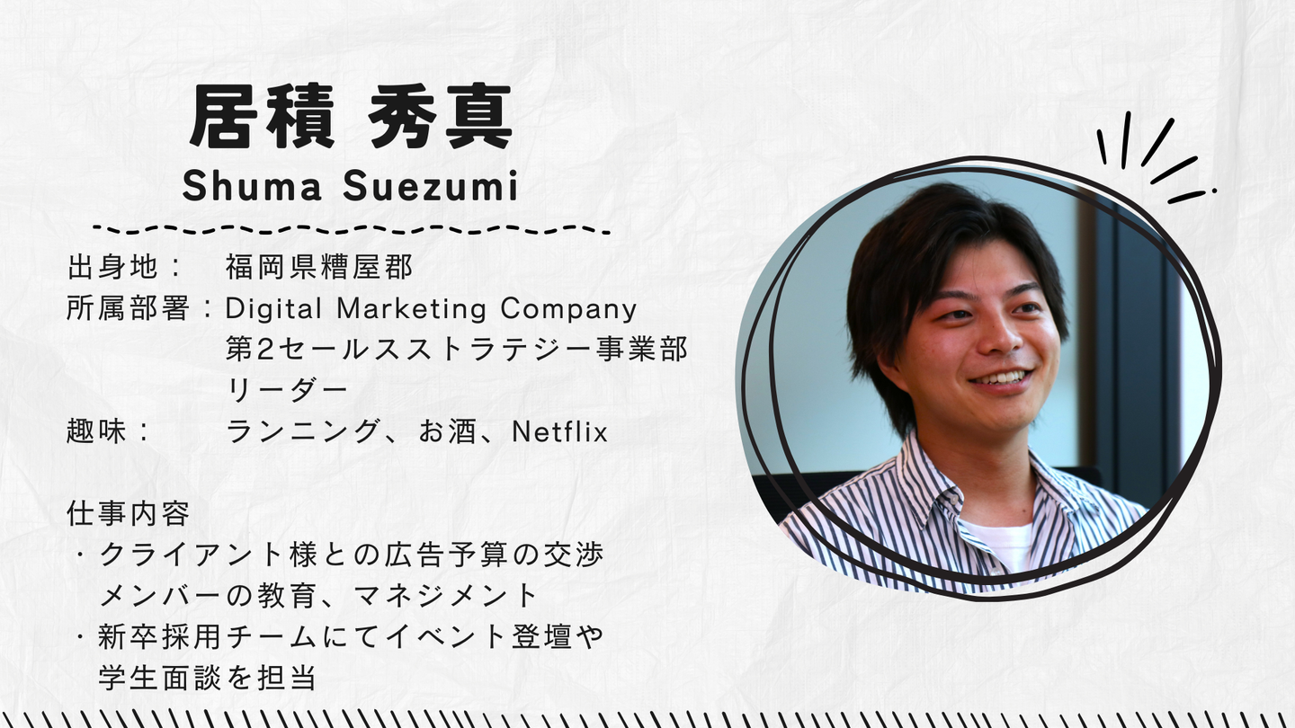 現在、DMC(広告事業)で営業リーダーを務めている社員さんですが、リーダーとして結果を出すことはもちろん、メンバーを育てる立場としても日々活躍されています!新卒採用にも携わっている居積さんの体験談は、就活生の皆さんにとっても大きな学びがあると思います!