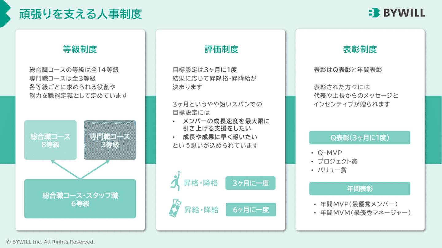 評価や表彰の話にも触れたので、人事制度についても少しお伝えできればと思います。面接や採用説明会などをしている中でも、けっこうよくご質問をいただく部分かなと思っています。