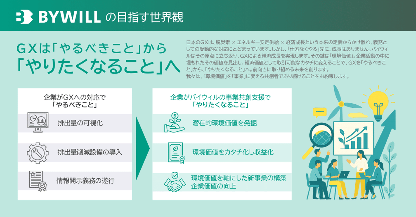 私たちバイウィルは、シリーズBの資金調達を経て、GXを次のステージに引き上げたいと考えています。すなわち、GXを「やるべきこと」から「やりたくなること」に変えることへの挑戦です。