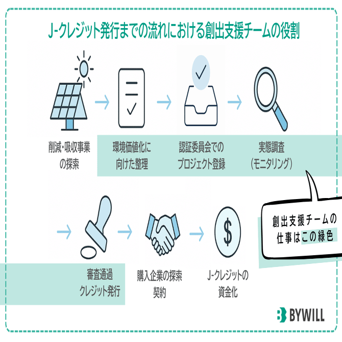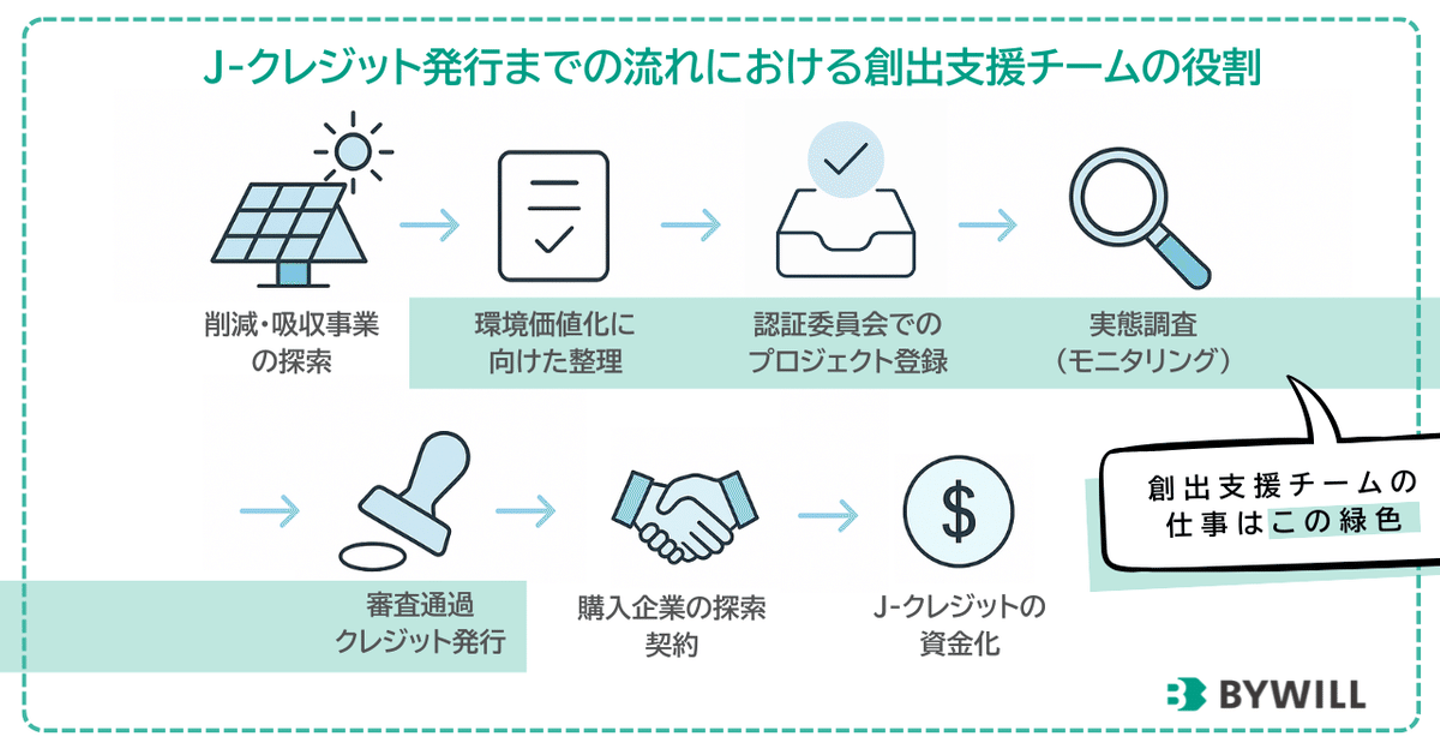 J-クレジットの発行されるまでには5つのステップがあって、私たち創出支援チームは削減・吸収事業の探索の後の4ステップを担っています。