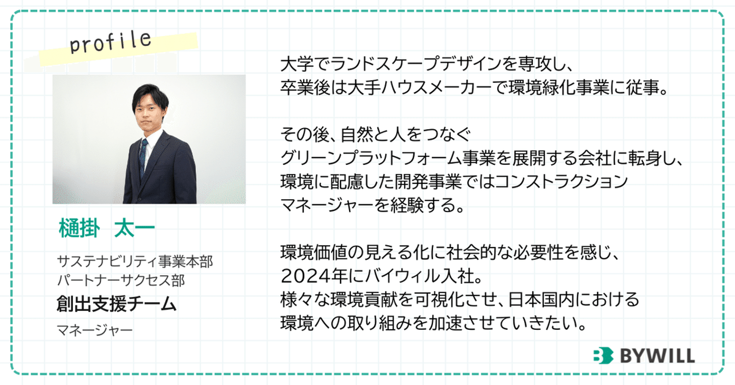 今回“脱炭素の現場”のやりがいとリアルについて、バイウィルの創出支援チームを率いる、マネージャーの樋掛さんにお伺いします。
