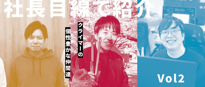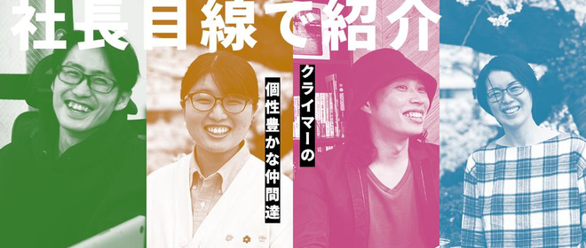 縁あってクライマーにたどり着いたメンバーですが、出身地や経歴も様々です。経験者だけでなく異業種から未経験で入社した者も多数おり、成長を続けています。