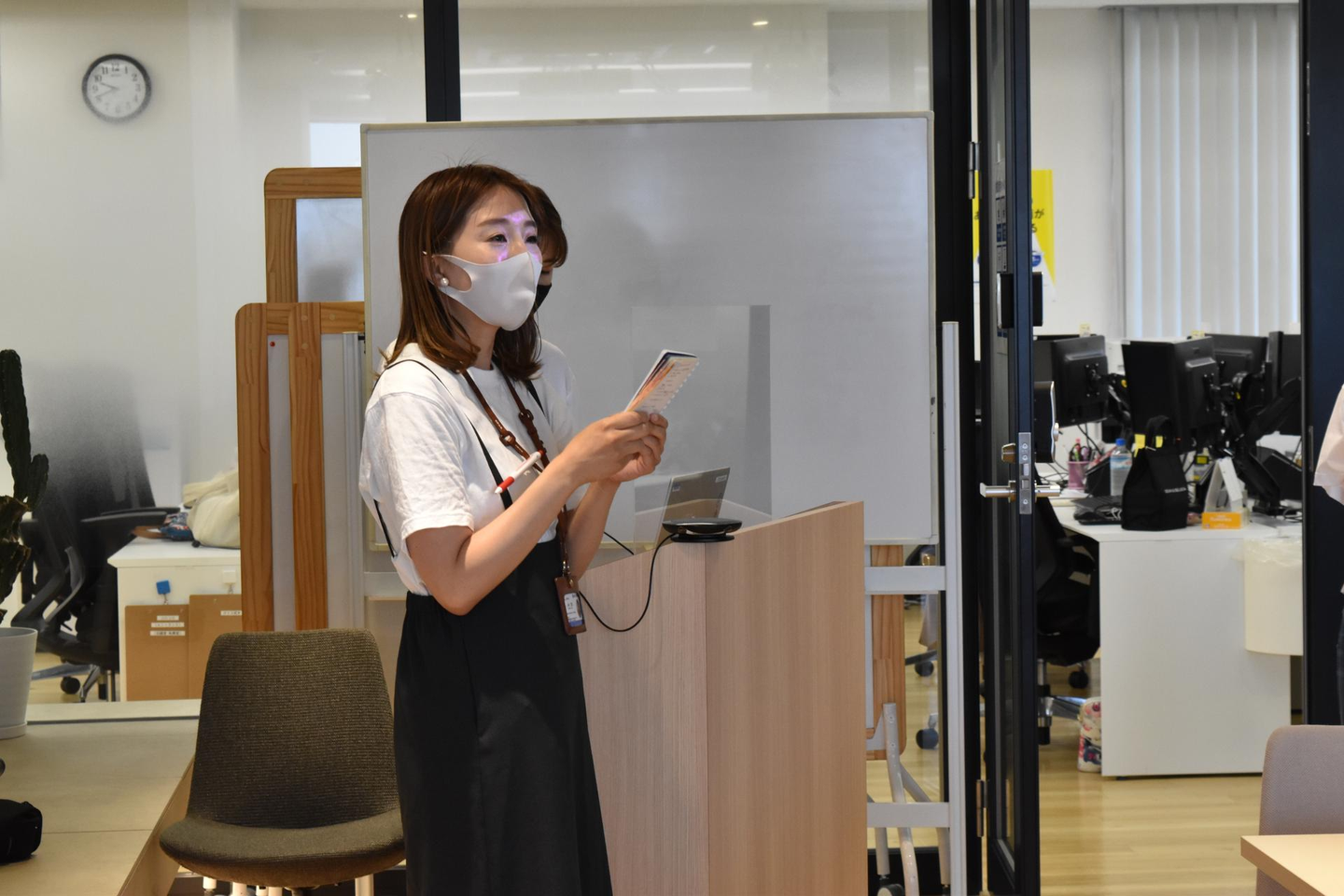 ↑人事部のこばさんが、感謝の朝礼でありがとうカードを読んでいる場面です~!