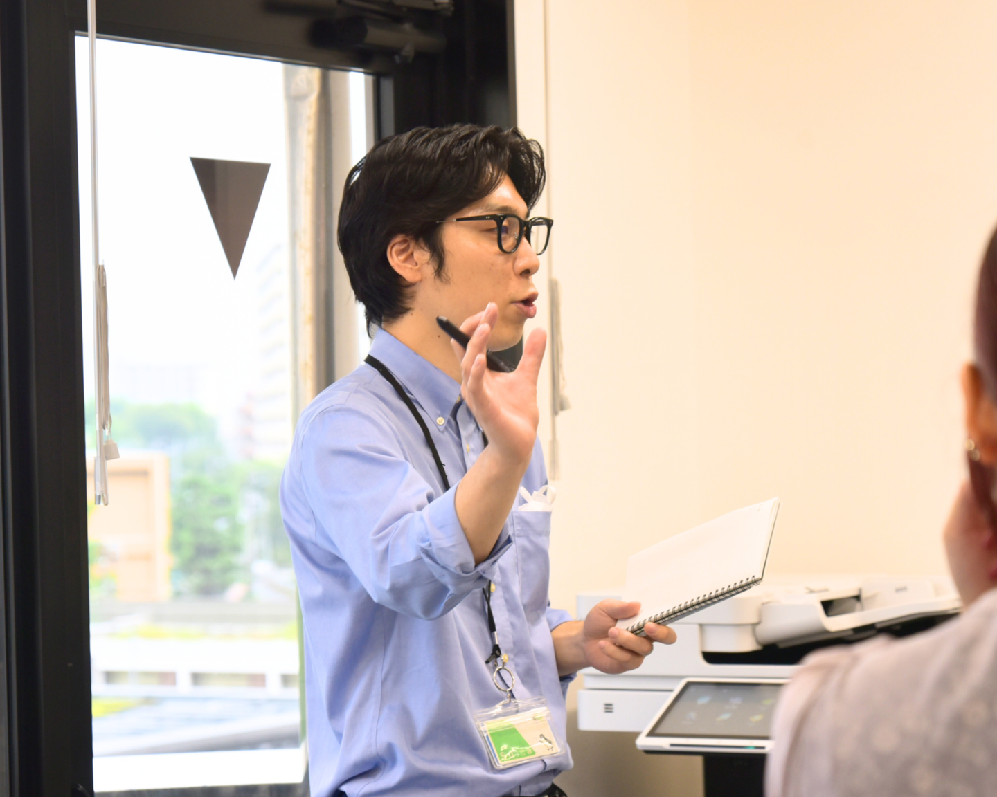 朝礼に参加すると、普段あまり仕事で関わることがない部署ともコミュニケーションが取れます。おかげで交流が活発ですね。前職でもワンフロアにいろいろな部署がありましたが、正直名前がわからない方がほとんどでした。そういった垣根がないため、他部署とも連携が取りやすく、現状の課題や動きも知れるので、全体像がつかみやすい環境です。