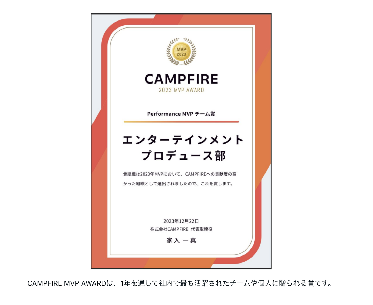 特にエンタメ部は、CAMPFIREにとってプロジェクトオーナーはお客さんではなく、ビジネスパートナーという意識で関わっています。 互いに良いものを世に出そうと取り組んだ結果としてお金や人が集まり、プロジェクトがうまくいくことが理想 だと思っています。社内MVPをいただけたのもそうした姿勢が結果に繋がったのではないでしょうか。