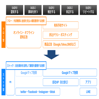 店舗ビジネスの集客方法は様々ありますが、大きく分けると外部機関に金銭を支払い顧客獲得する「フロー型施策」と自社媒体を活用して顧客を蓄積する「ストック型施策」に大別できます。
