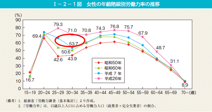 M字曲線ともいわれているこの図は、かつて20代半ばで結婚をしたら寿退社をし、家庭に入り主婦となり、出産・子育てを経て、パート勤務で働く日本の【男は仕事、女は家庭】そのものが出ています。