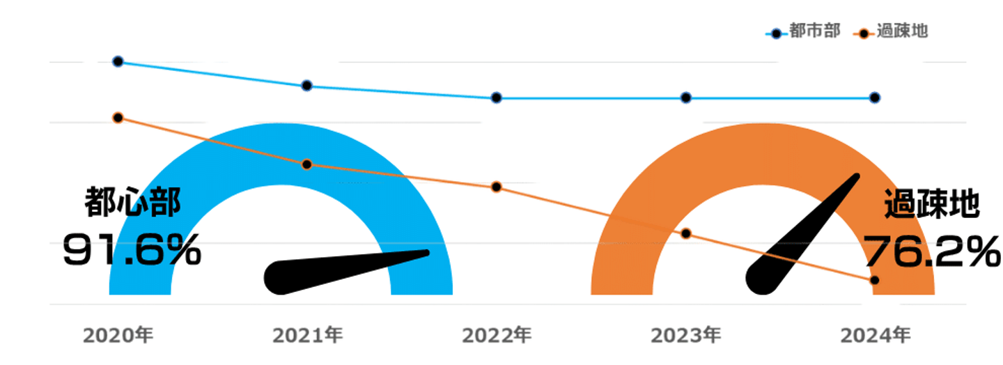 これは、保育所の定員に対して、実際にどれだけの子どもが入れているかを示す数字です。過疎地域では、4つある席のうち1つが空いているような状態。しかもこの数字は、この4年で7%近くも急落しています。