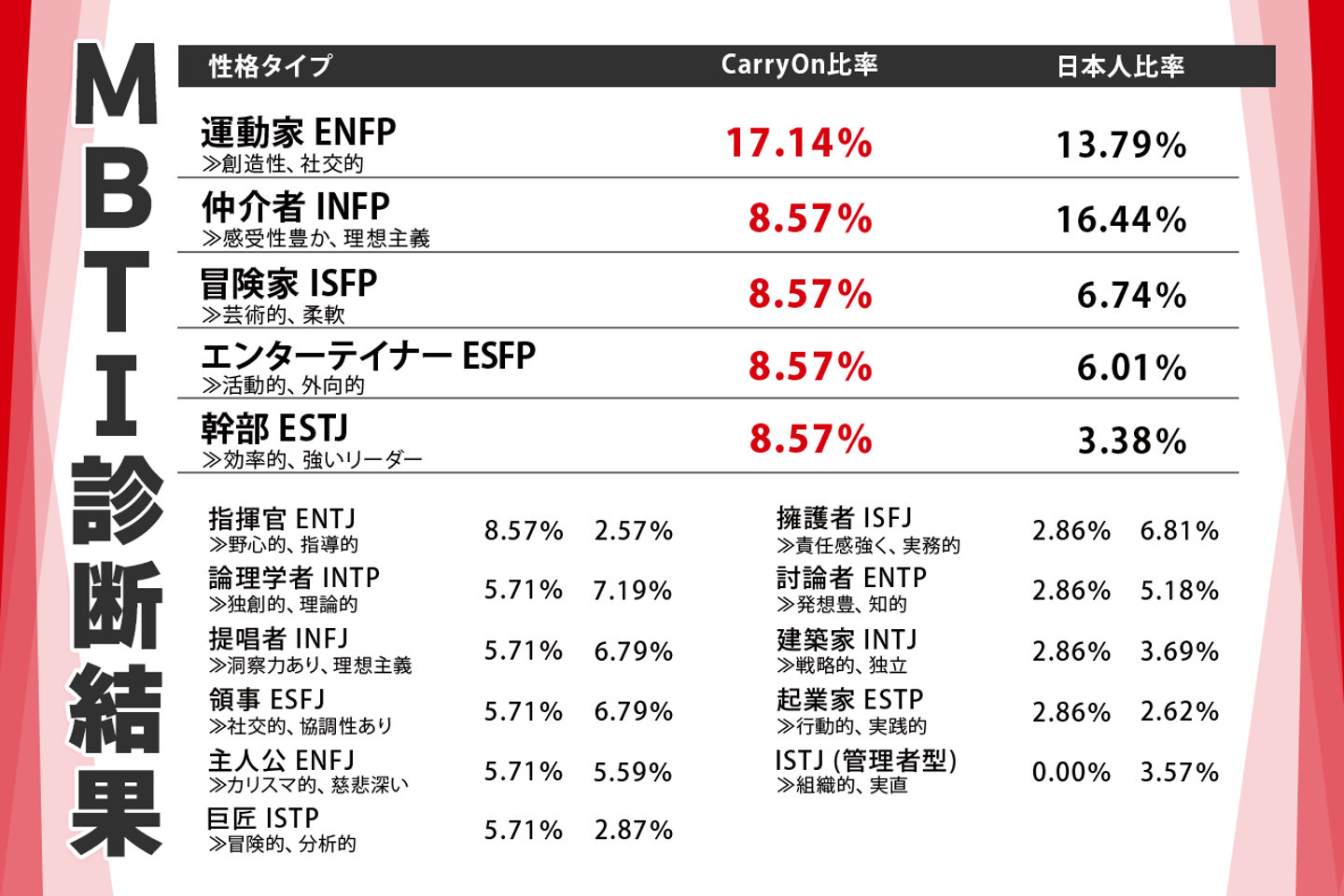 Carry Onでは、ISFP「冒険家」やESFP「エンターテイナー」、そして効率的なリーダーシップを発揮するESTJ「幹部」など、様々な個性を持つメンバーが集まり、クリエイティブで活気ある環境を形作っています。
