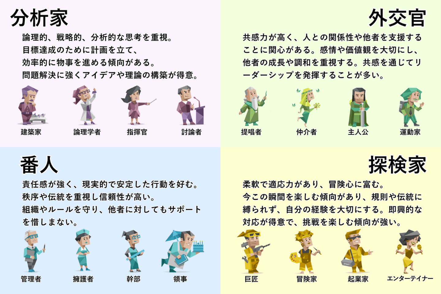 これらのアルファベットの組み合わせで、16種類の性格タイプが形成されます。