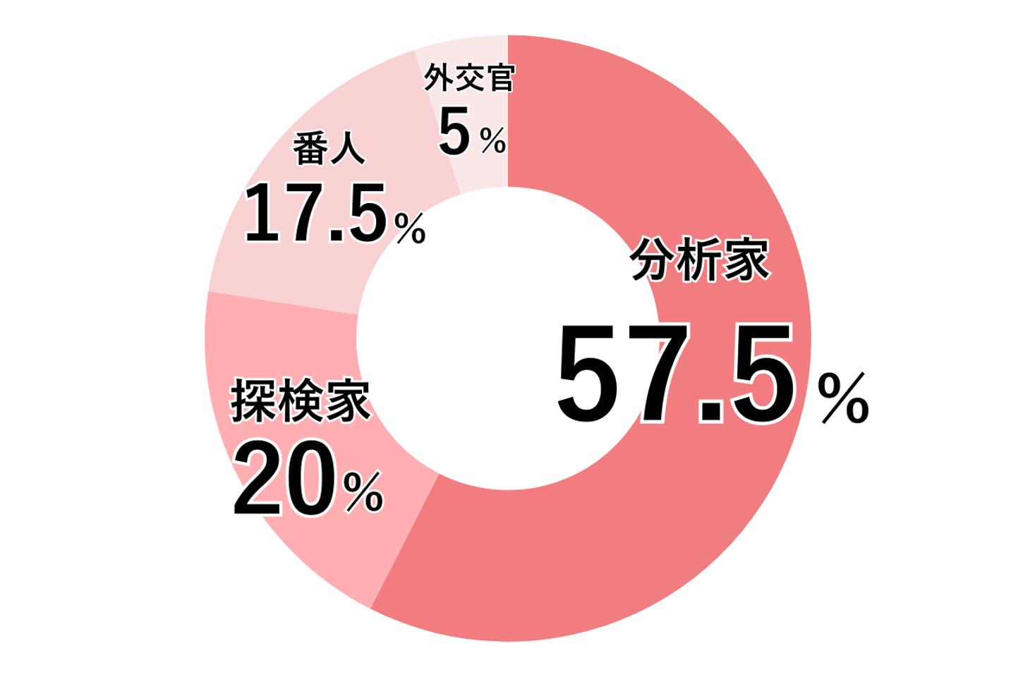 Carry Onの4つのグループの比率は、 分析家57.5%、探検家20%、番人17.5%、外交官5%。