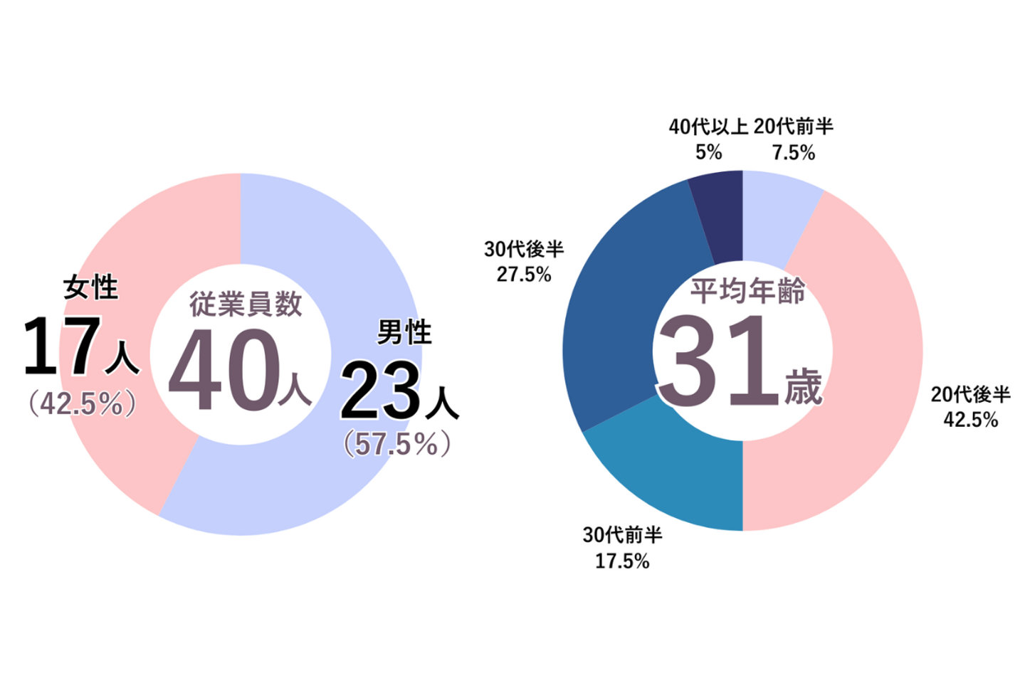 平均年齢は31歳。東京都産業労働局のデータによると、中小企業で最も多い平均年齢層は40~49歳であり、それと比べると当社はかなり若い会社と言えます。特に20代後半(25~29歳)が多く、年齢に関係なくみんなでお昼ご飯を食べたり、社内イベントを楽しんだりと、フラットで活発なコミュニケーションが特徴的です。