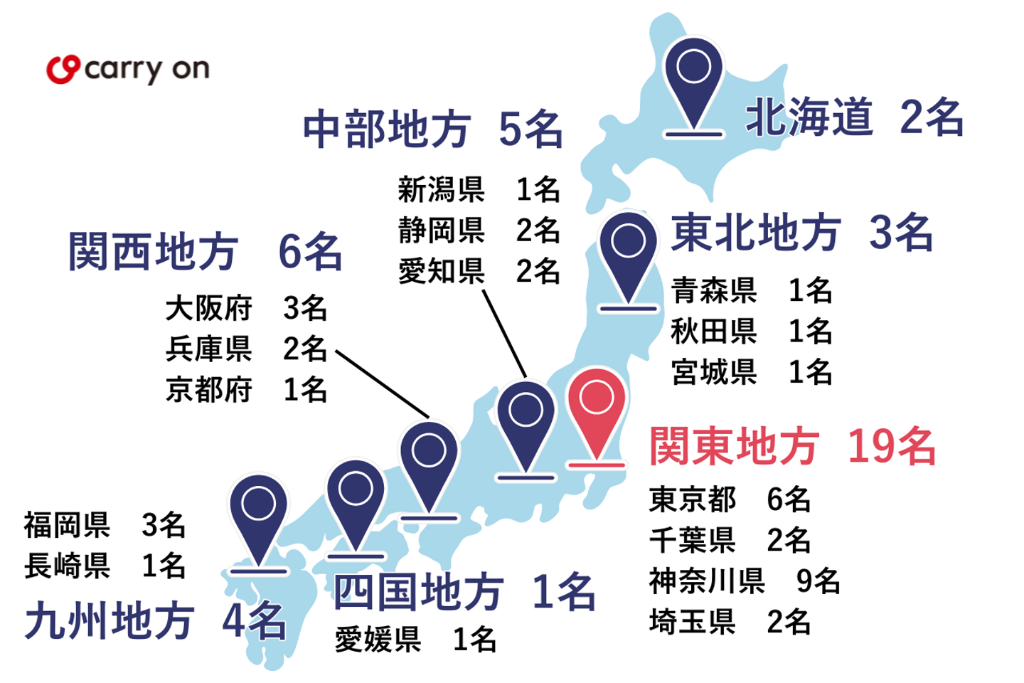 東京に本社を置く会社だけあって、半数近くは関東地方出身者です。