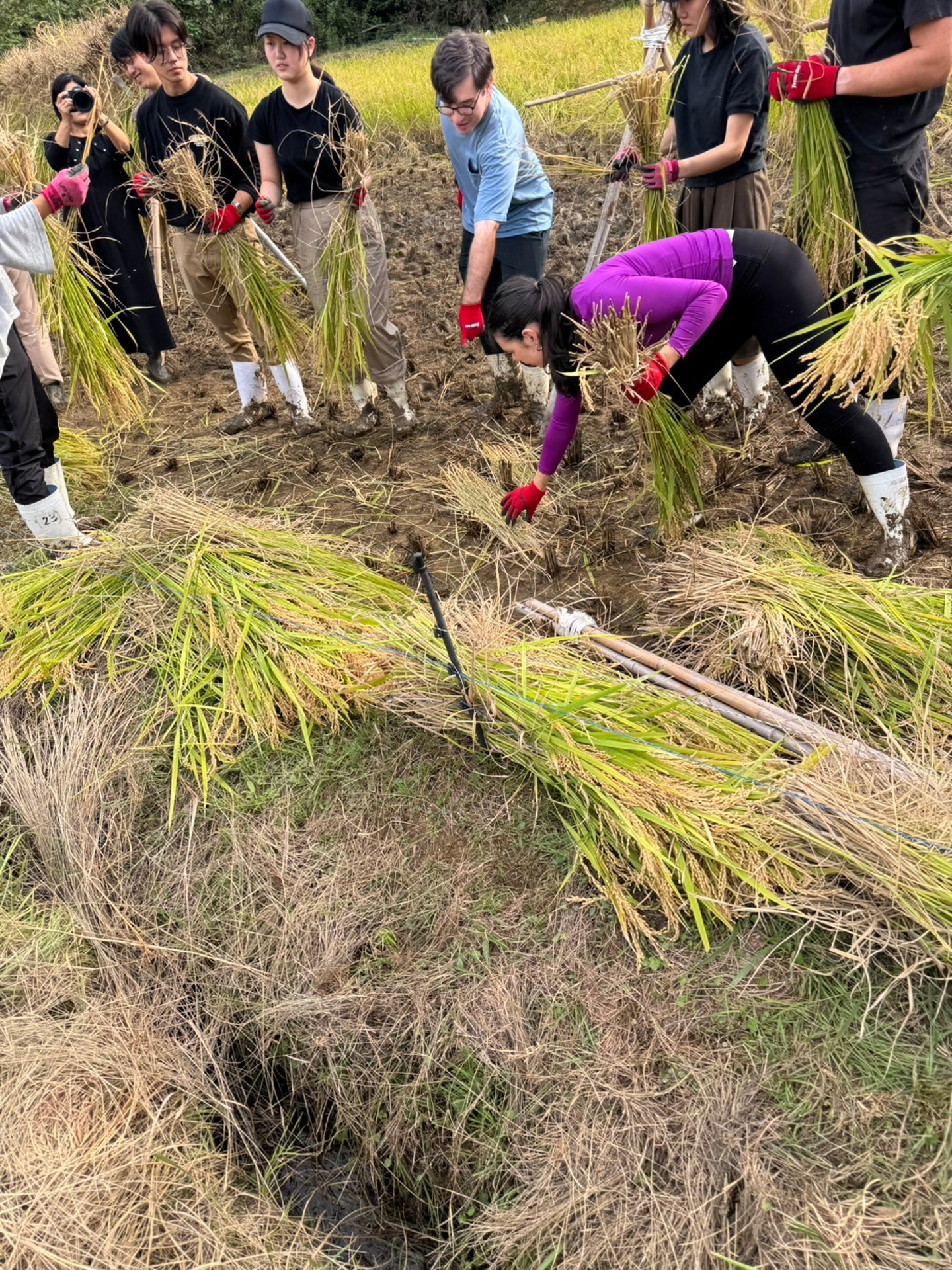皆さん初めての稲刈り体験ということもあり、鋸鎌をうまく扱えるか不安そうな表情が見られましたが、いざ稲刈りを始めると、次第に楽しそうな表情で収穫を進めていました。