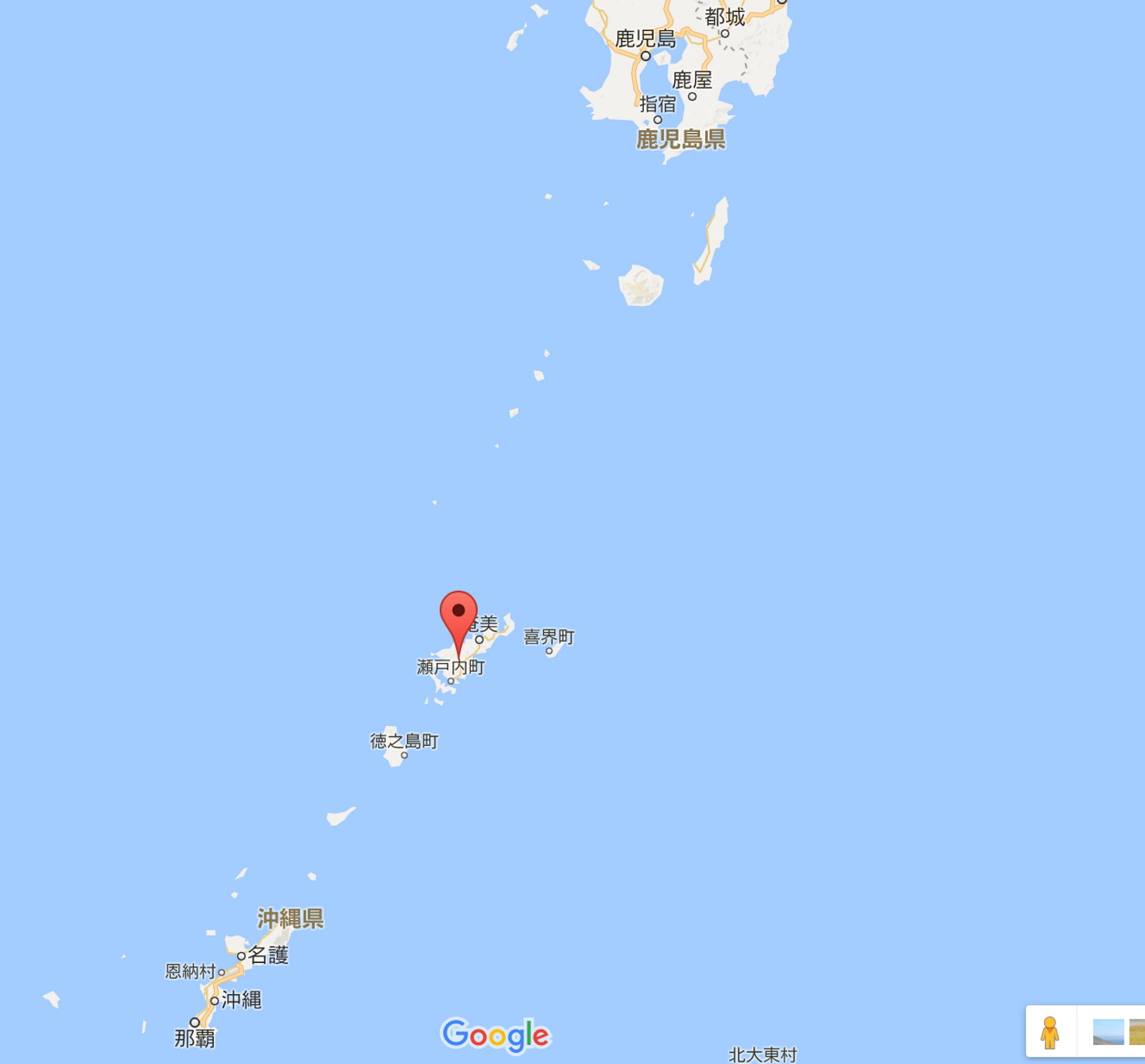ちなみに奄美大島はこのあたり。鹿児島と沖縄の間にある、海がきれいな島です。