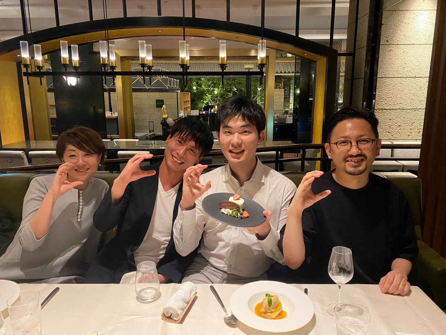 入社記念にボードメンバーとパチリ。しなだれかかっているのは嬢ではなくCEOです。