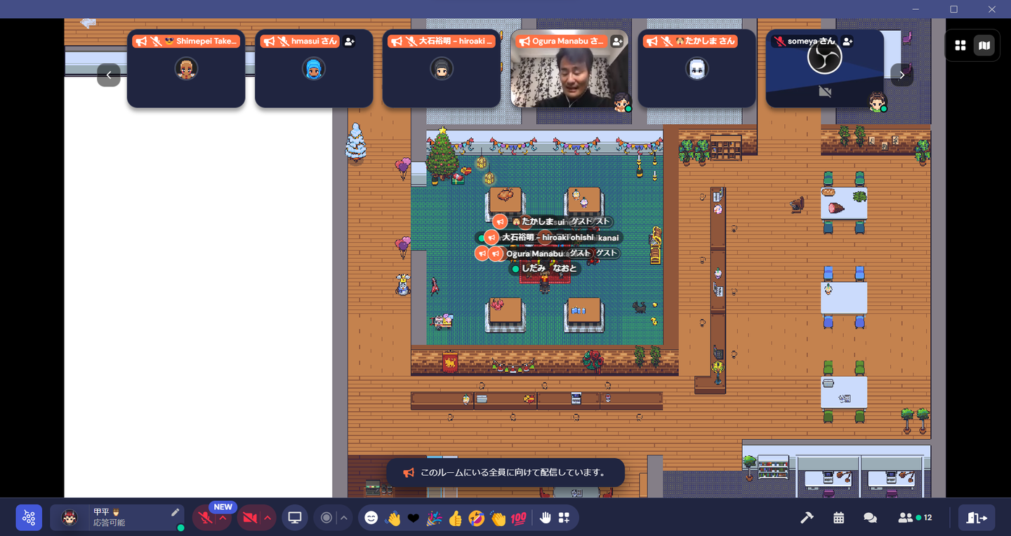 こちらは実際のGather Townの画面です。クリスマス仕様の部屋を作成し、そこで総会を行いました。