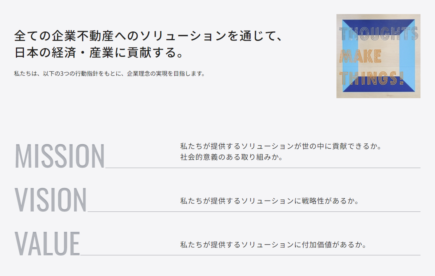 当社は、2019年7月の創業以来、“全ての企業不動産へのソリューションを通じて、日本の経済・ 産業に貢献する。”を企業理念に、これまで数多くの企業のCREニーズに応えるサービスを提供し て参りました。当社では、真のCRE戦略とは、単に不動産の売買を行うことではなく、「その最適 な保有・利用方針を経営戦略・財務戦略と合わせて日頃から検討し、然るべきタイミングで戦略性 を持って実行すること」であると考えております。足元の経営環境は、不安定な世界情勢、急激な 為替変動、物価高騰、資本効率改善に対する資本市場からの要請等、ますます複雑さを増しており、 企業不動産戦略(CRE戦略)を経営戦略・財務戦略と一体で検討する重要性が高まっております。