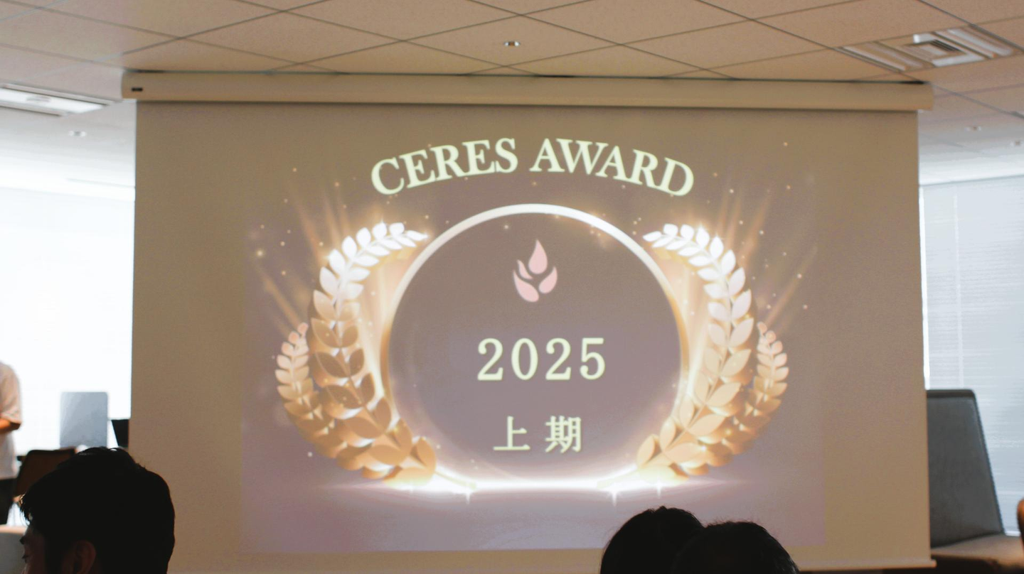 「CERES AWARD」とは、半期に一度、リーダー職以下の従業員を対象に、会社に大きく貢献した従業員を経営陣が選出し(特別賞を除く)、表彰する制度です。優秀賞の中から最後にMVPが1名発表され、受賞者は副賞として金一封が贈呈されます!