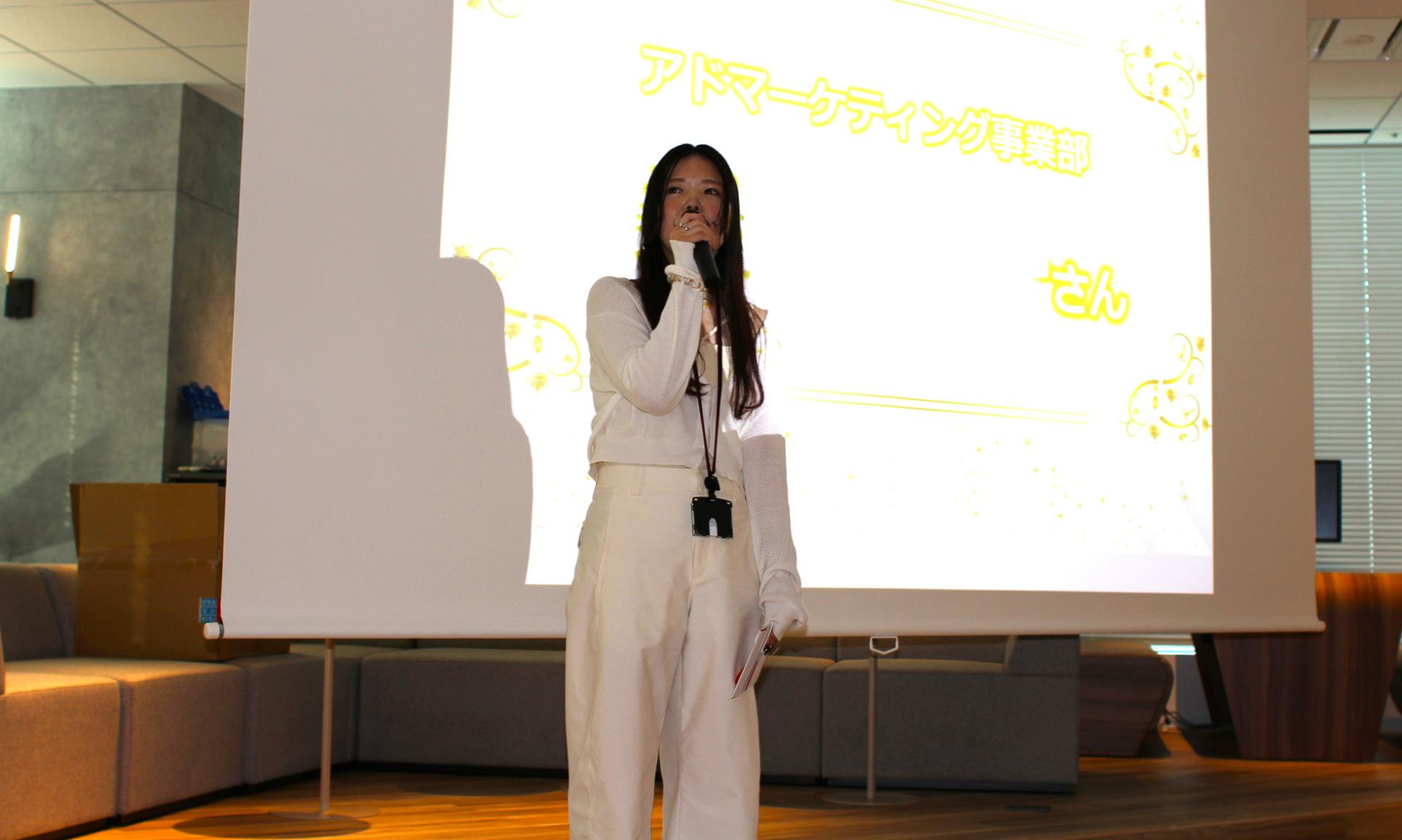 直近6ヶ月間に入社した中途入社社員の中でもっとも活躍した社員に贈られる「中途新人賞」は、アドマーケティング事業部のTさんが受賞。会場から「おめでとう」の声が飛び交い、社長からも「人気者だね!」と声をかけられる場面もありました。