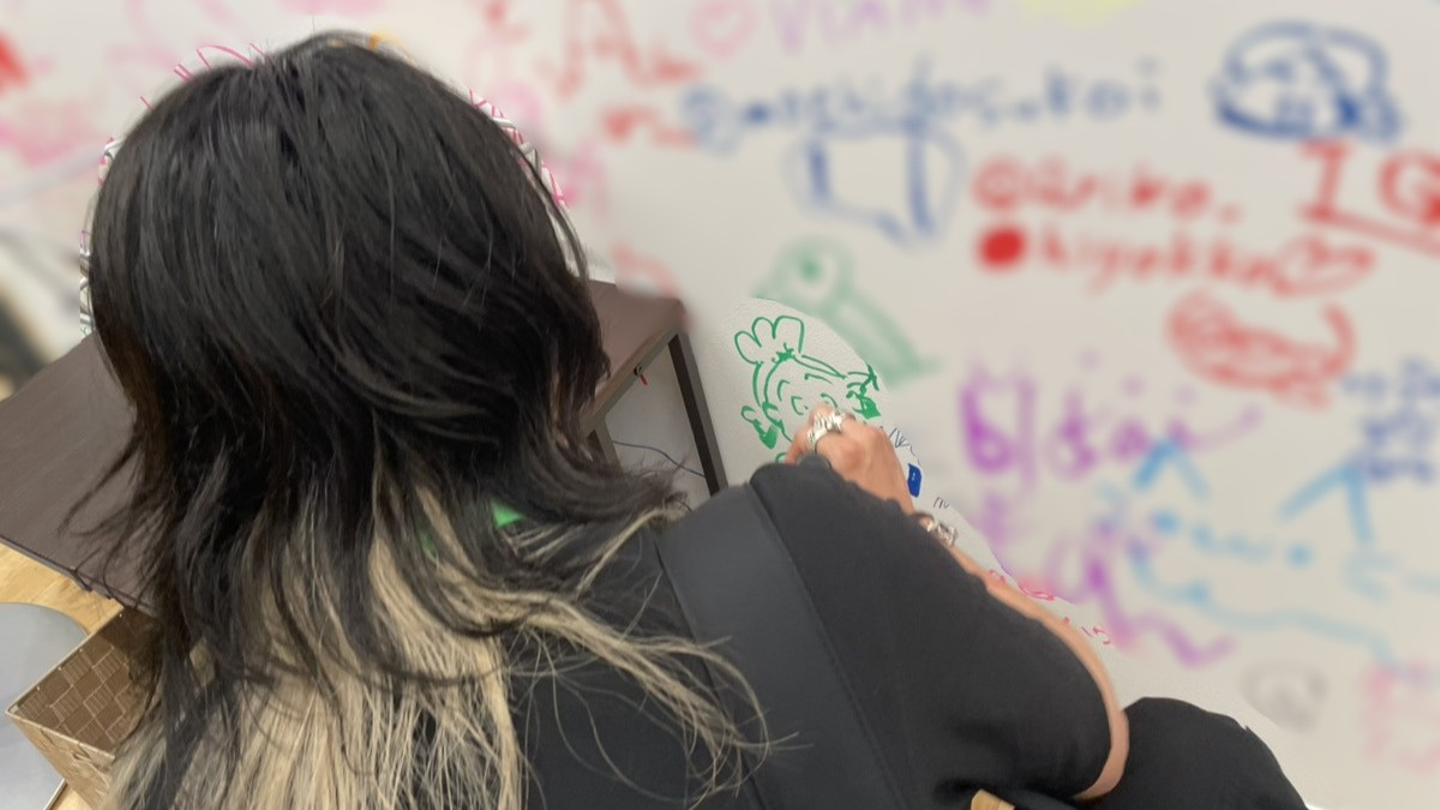 (来訪者ボードには氏名と一緒にキャラクターを描く方も多く、弊社岡田はサザエさんを)