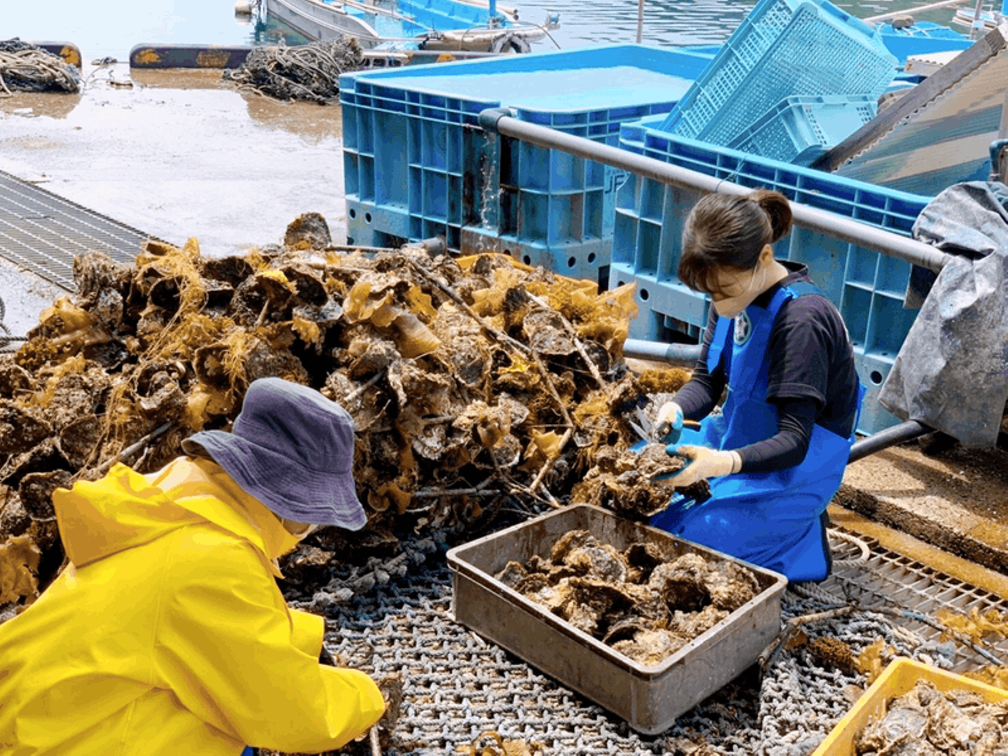 村の牡蠣組合では6人の漁師さんが個人で働いていますが、規模の大きな事業所でイワガキ養殖をやっているところがひとつあります。ここでは従業員も雇っているので個人でやっているカキ漁師さんよりも出荷数が多いです。