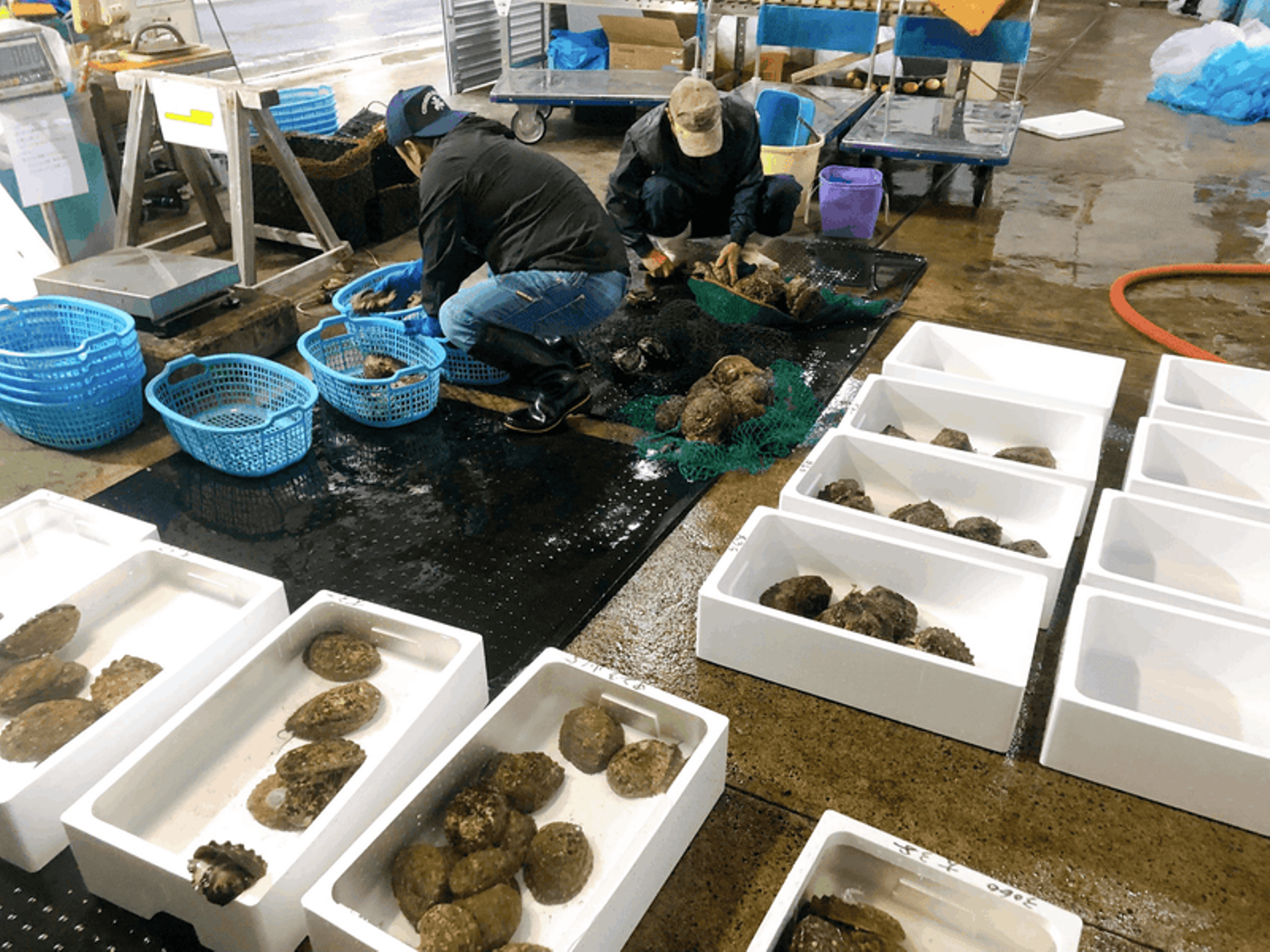 基本的には朝、漁師さんが獲った魚を漁協へ持ってきて、伝票をつけながら漁協の職員さんと出荷の準備をします。5月の連休前は大きなアワビが大量に出荷されていたことも。アワビは獲ってから生け簀においておき、値段の良いときに出荷するよう調整ができるみたいです。