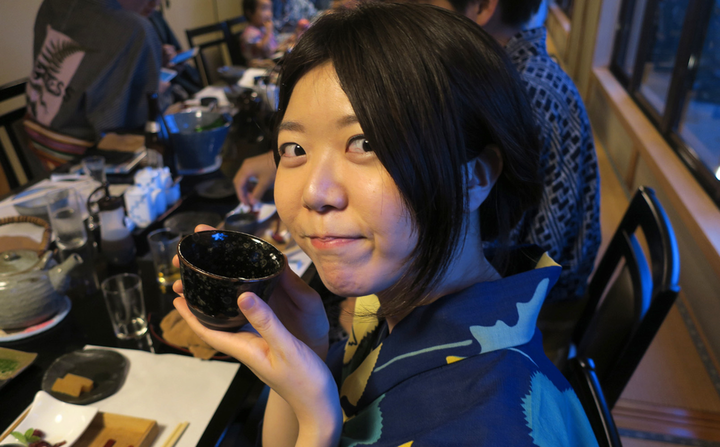 大好きなお酒と料理により、大仏降臨! 横にチンネンがいますね。