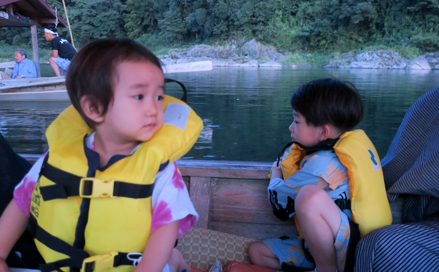子どもたちも川のお船が珍しげ、ちょっと緊張してるかな?