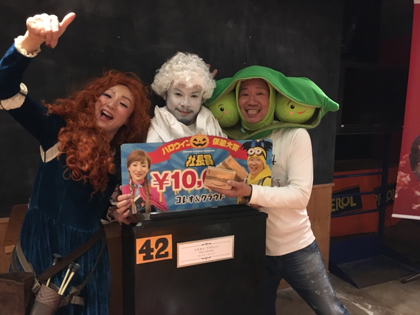 毎年ユニークな仮装で賞の常連YU-TO。今年は石膏像で勝負してきました!しかも大きな台座まで用意する周到ぶり(前夜の3時に野外で作ったらしい…)。さすがの受賞です!