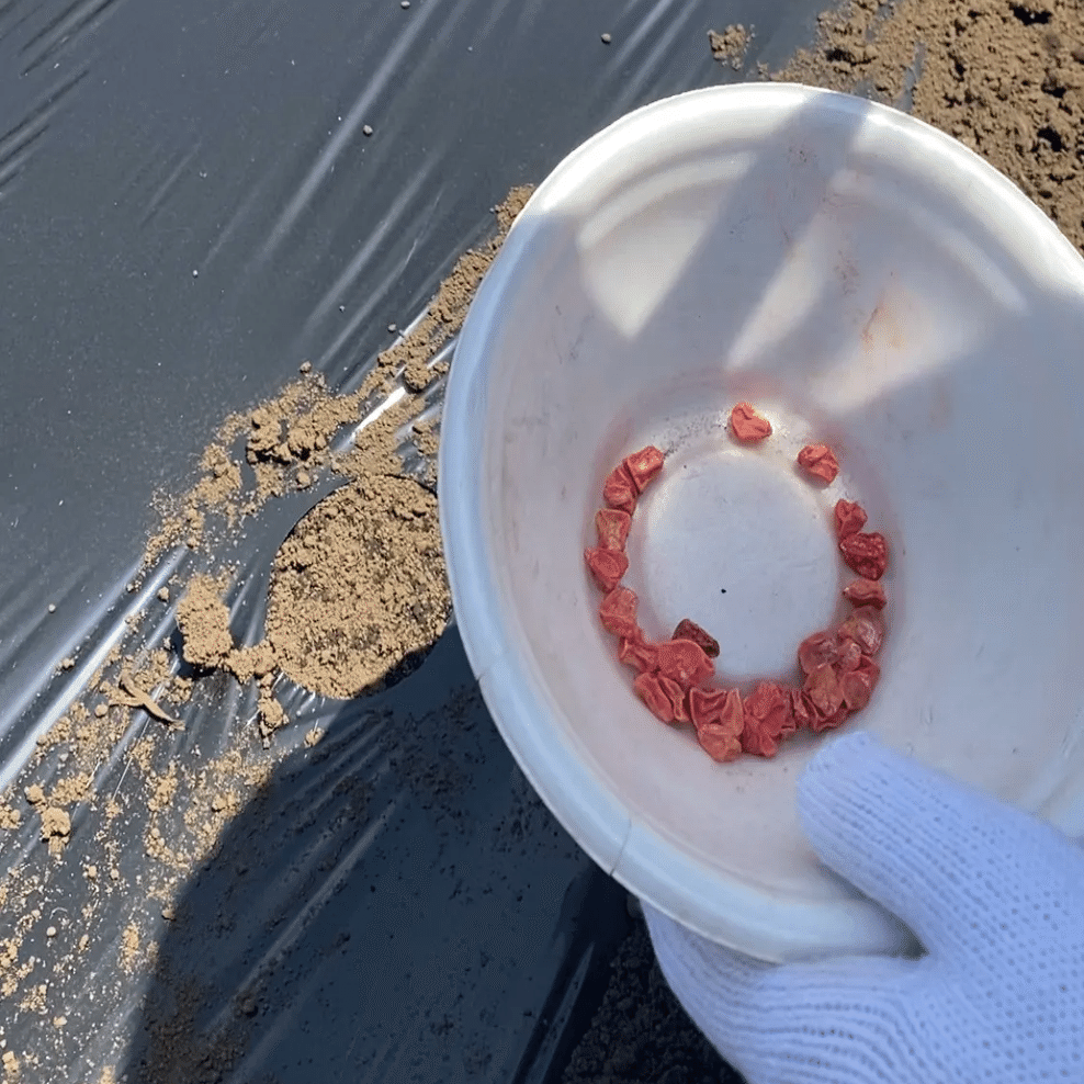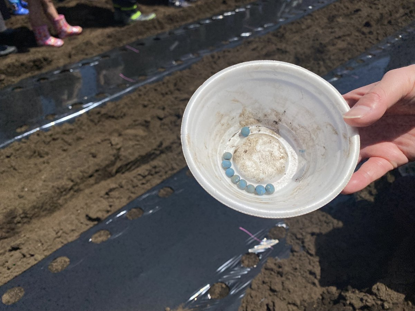 5月の土曜日、畑に着くと地方公共団体の職員と農家の方々がすでに準備を進めていました。参加者は説明を受けて種をまきます(赤い種がトウモロコシ、青い種がエダマメ)。そのあと農家の方への質問タイムがあり、種まきはおわりました。