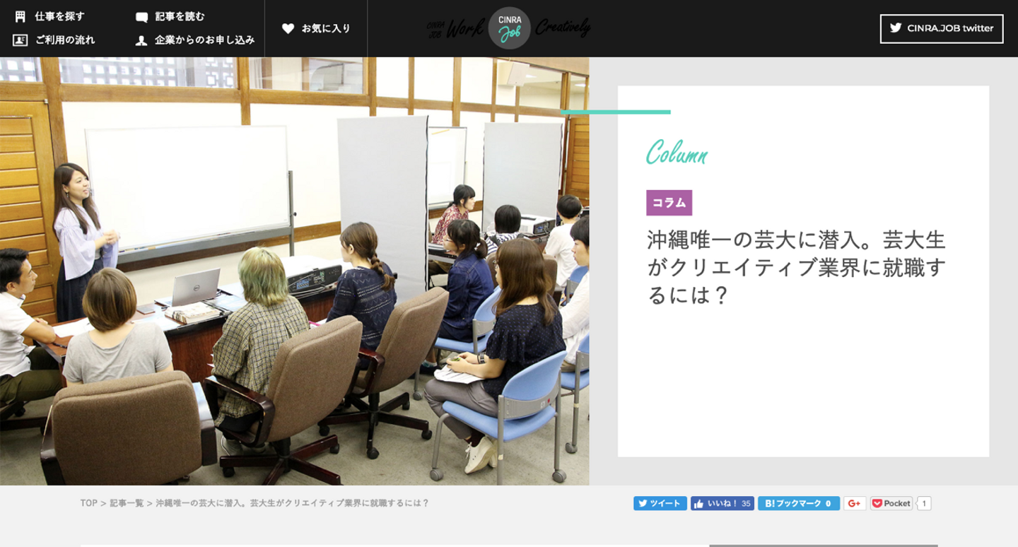 CINRAが日本最南端の芸術大学である沖縄県立芸術大学の学生と、沖縄県内外のクリエイティブ業界で活躍する企業を繋ぐ「クリエイティブ業界 就職支援プログラム」。このプログラムでは、沖縄県内外の企業を集めた合同説明会や、学生・保護者・教職員に向けた講演会の開催や、沖縄と東京でのインターンシップなどを実施しました。それらを通じ、沖縄の芸大生たちが就活を身近に感じ、クリエイティブ業界へと進出するキッカケ作りとなる就職活動を私たちは支援しています。