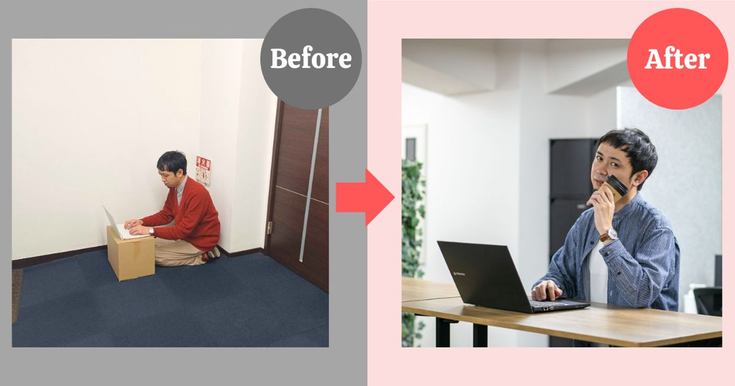 ▼段ボールをデスク代わりに仕事していた取締役・築井の劇的アフター!
