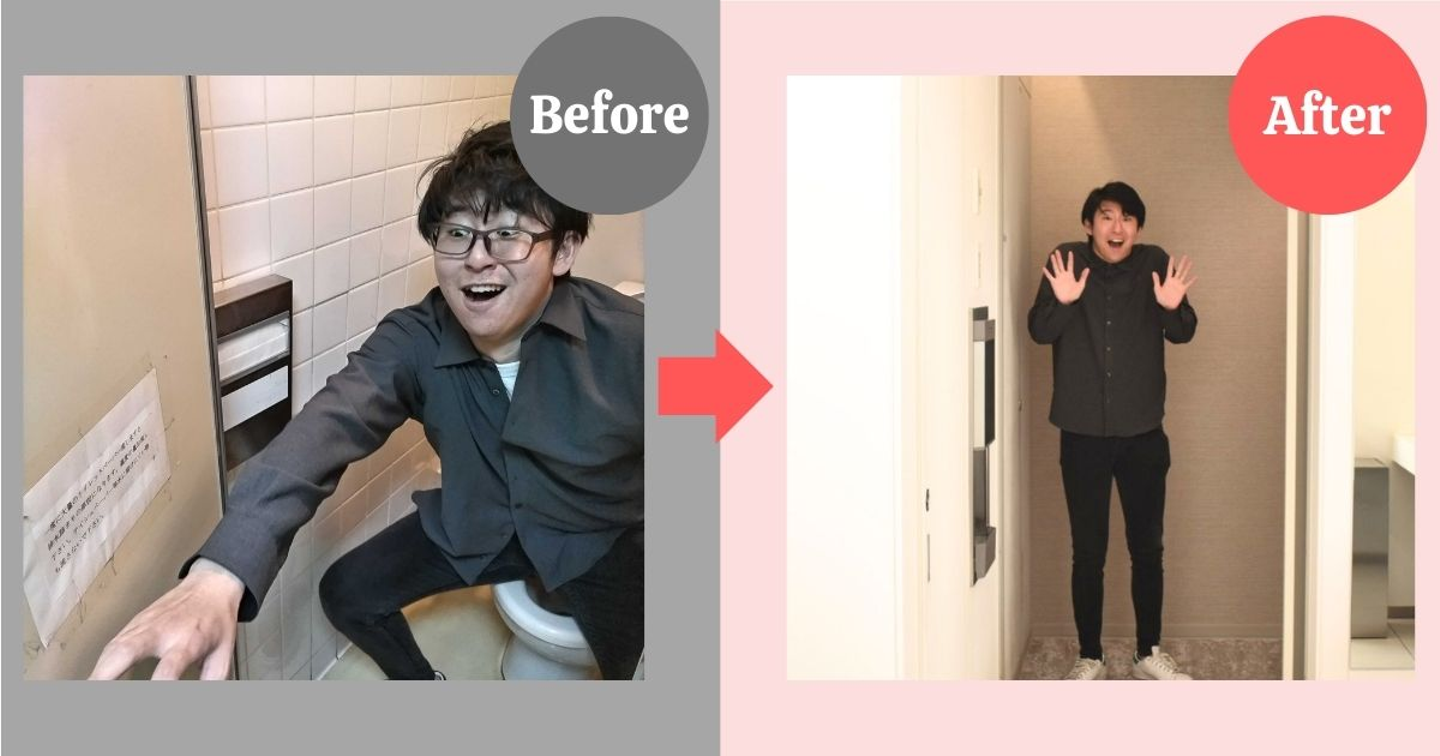 ▼トイレの個室が狭い…狭すぎる(泣)。でも新オフィスはトイレもキレイで広々!!