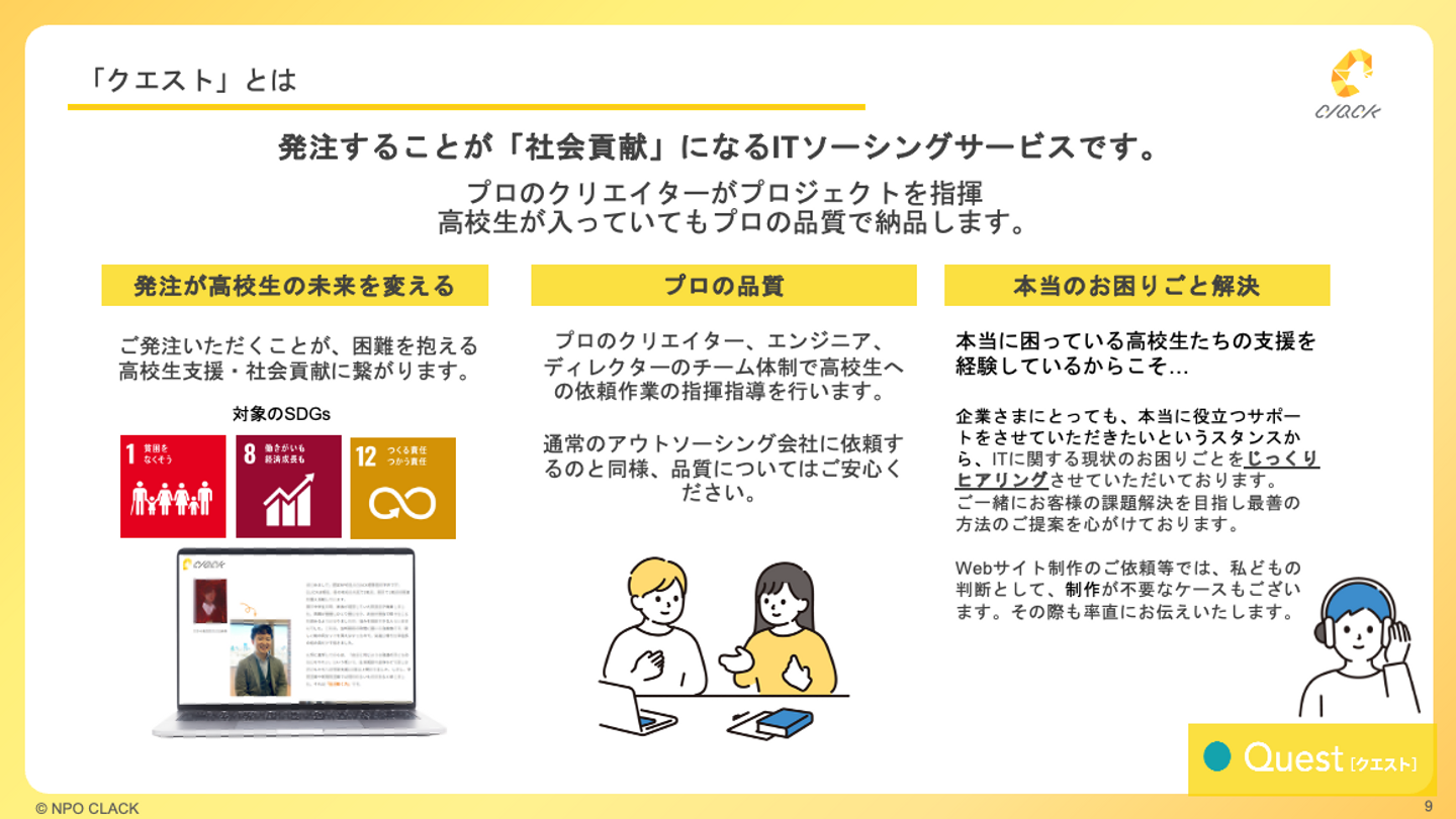 また、クエストに関しては、高校生が仕事をするところを主題には置いてはいますが、プロのクリエイターがリードしているのも大事な要素で、高校生だから納品物のクオリティーが落ちることを許容してもらうとかではなく、きちんと質を担保する体制を構築しているのも強みです。なので、限定的な案件しか受けられないわけではなく、一般的なWeb制作業界であったり、ITアウトソーシング業界の中でもバリューを出していけるのかなと思っています。