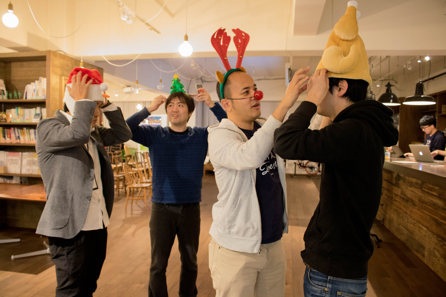 左下から静かににサンタクロースの帽子をかぶるJapanTaxiCTO・岩田さん、クリスマスツリーが頭から生えてしまったように見えるモデレーターの弊社プロダクト部・本間、優しくかぶり方を教えてくれているトナカイはトレタCTO・増井さん、唐揚げだけに留まらずターキーまでも自分のものにしてしまう弊社CTO・佐々木。(とっても楽しそうです…)