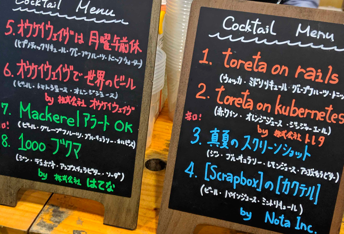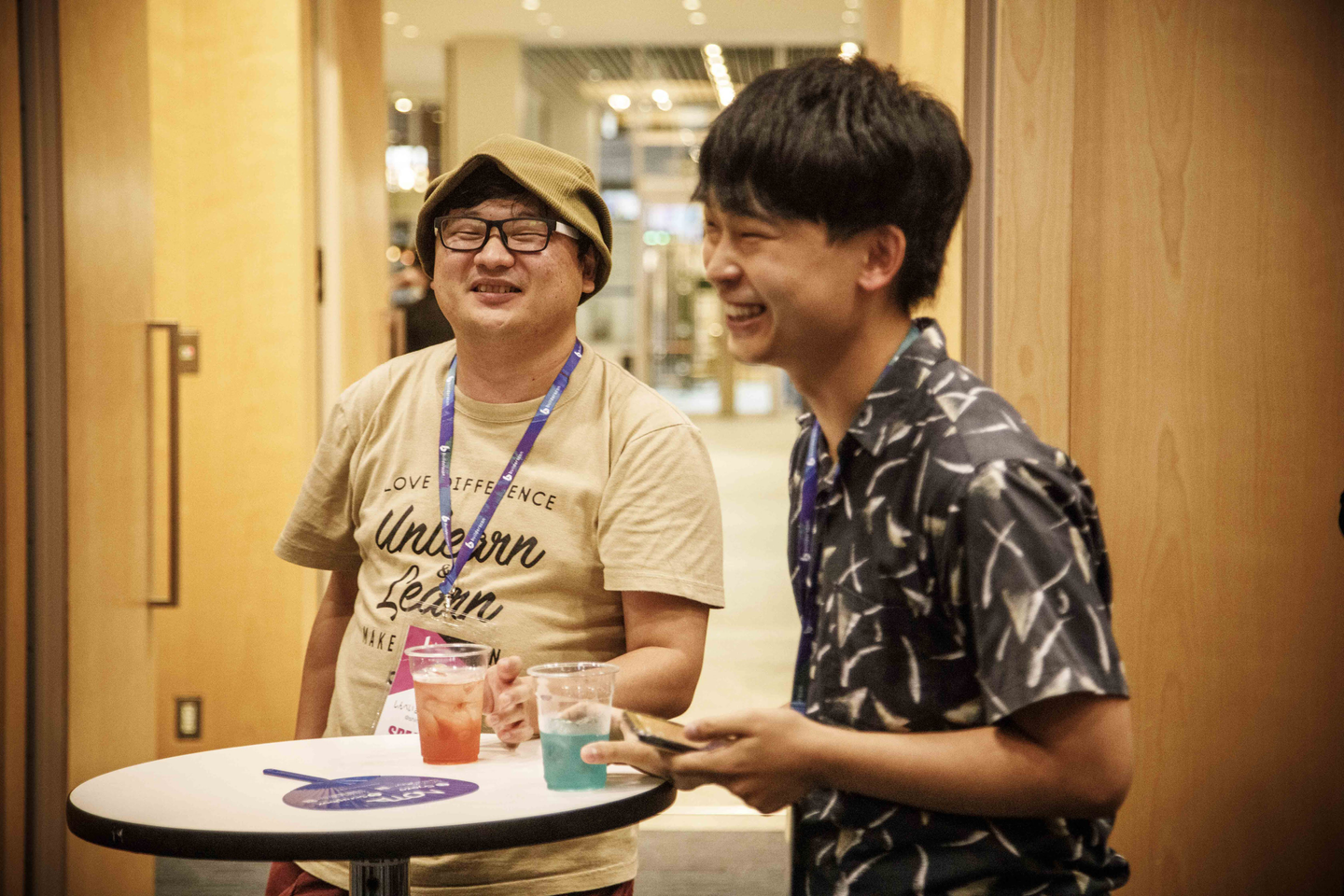 登壇を終えたShimpeimさんをカクテルで労う、Classiのエンジニアの原さん。