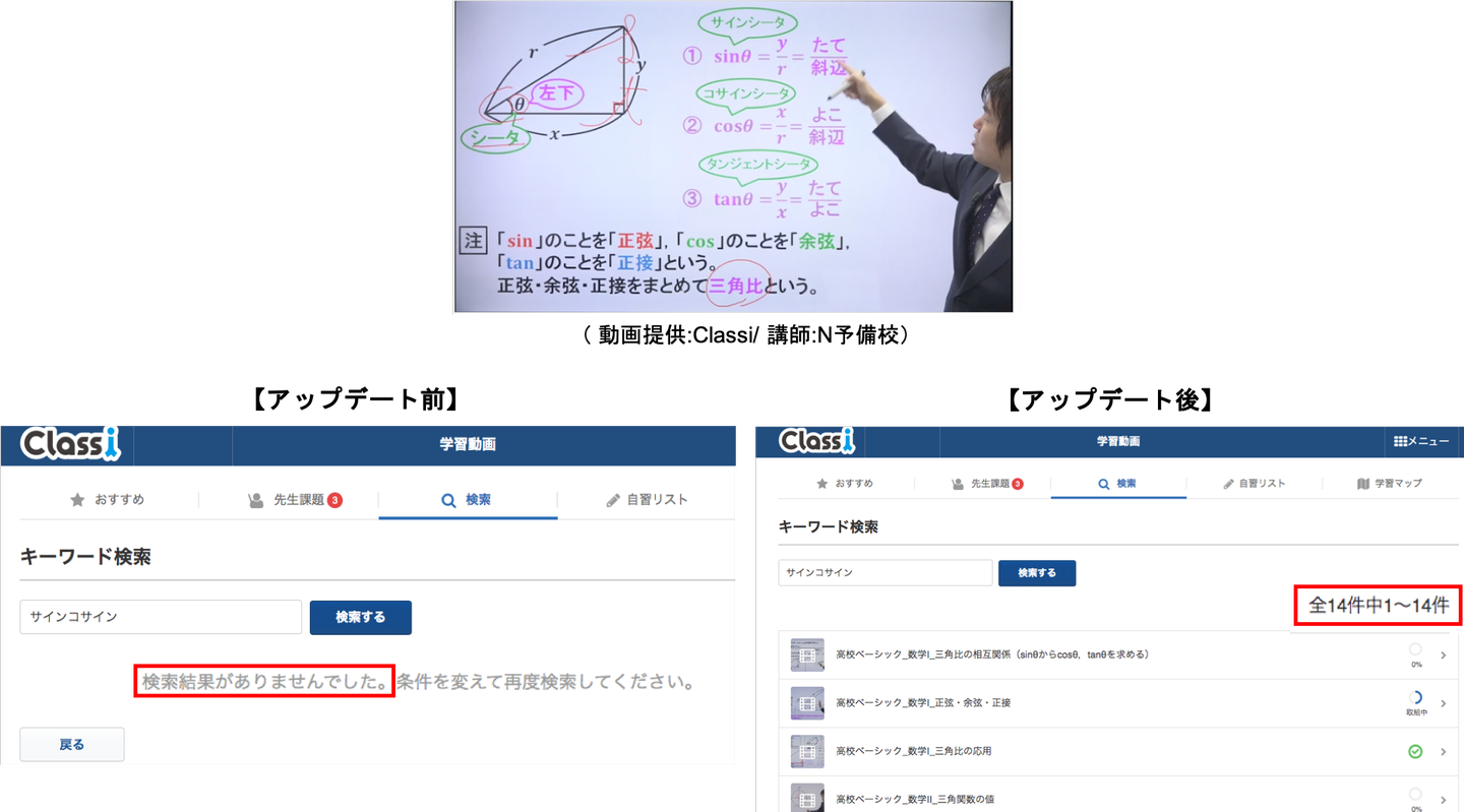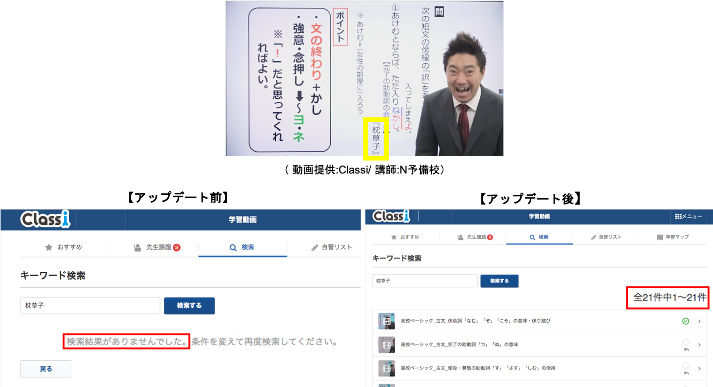 Classi株式会社が提供する教育プラットフォーム「Classi(クラッシー)」は、この度学習動画の検索機能をアップデートしました。それにより、従来の動画タイトルに含まれる単語による検索に加えて、動画内の「板書」や「音声」に含まれる単語による検索が可能になりました。