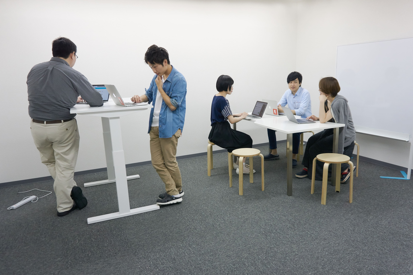 接客や少人数でMTGをするお部屋。パーテーションで区切って、2つくらいのMTGスペースつくりたいと考えています。スタンディングデスクもできたので、さっと何か確認したいときなどにつかえます。