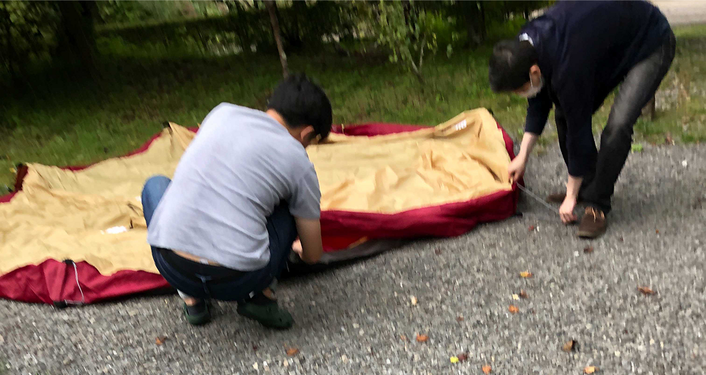 お昼過ぎに到着して、まずはテントの組み立て。 金さんにお手伝いしてもらってなんとか完成しました。