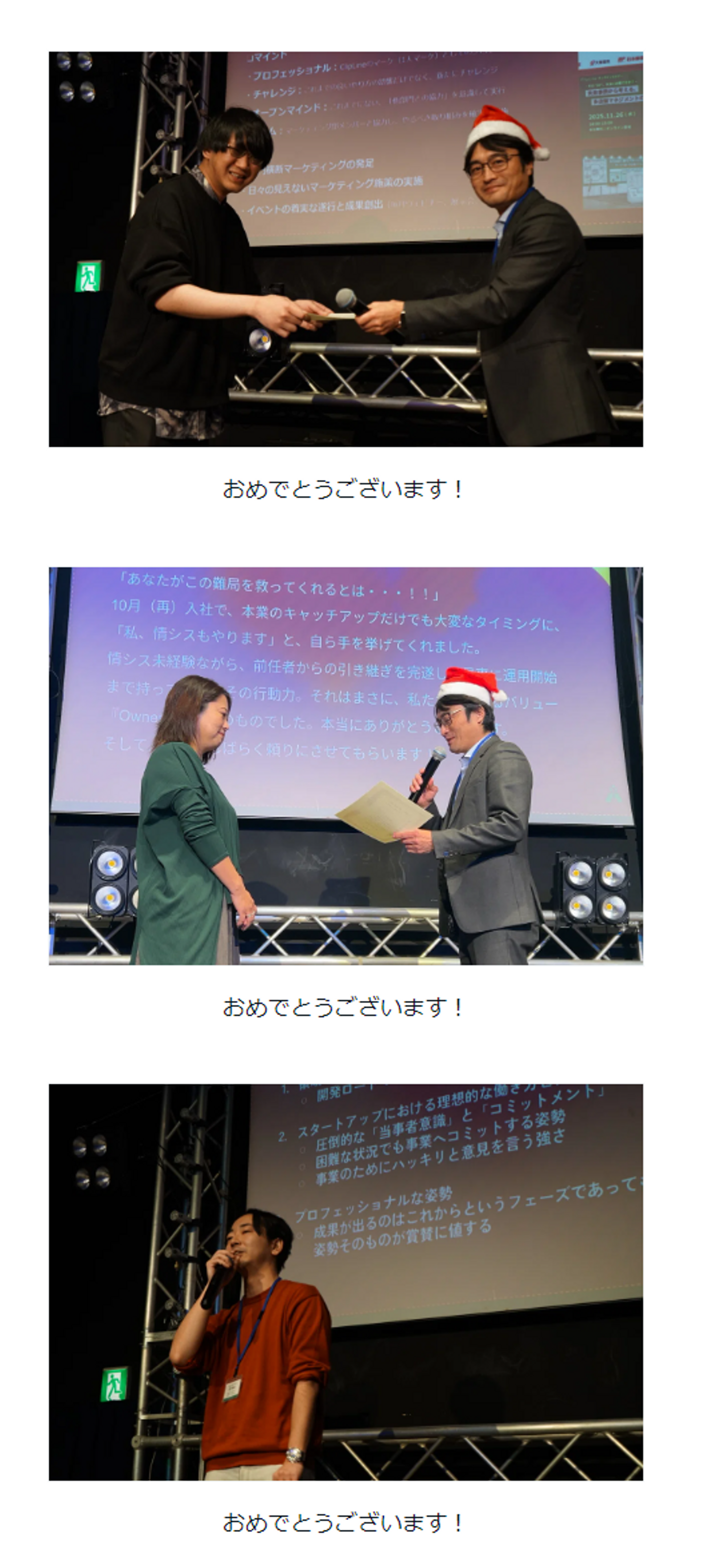 残る1名は、当日、クライアントの現場で勤務中だったため、事前録画された受賞コメントが再生されました。おめでとうございます!